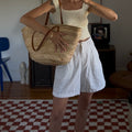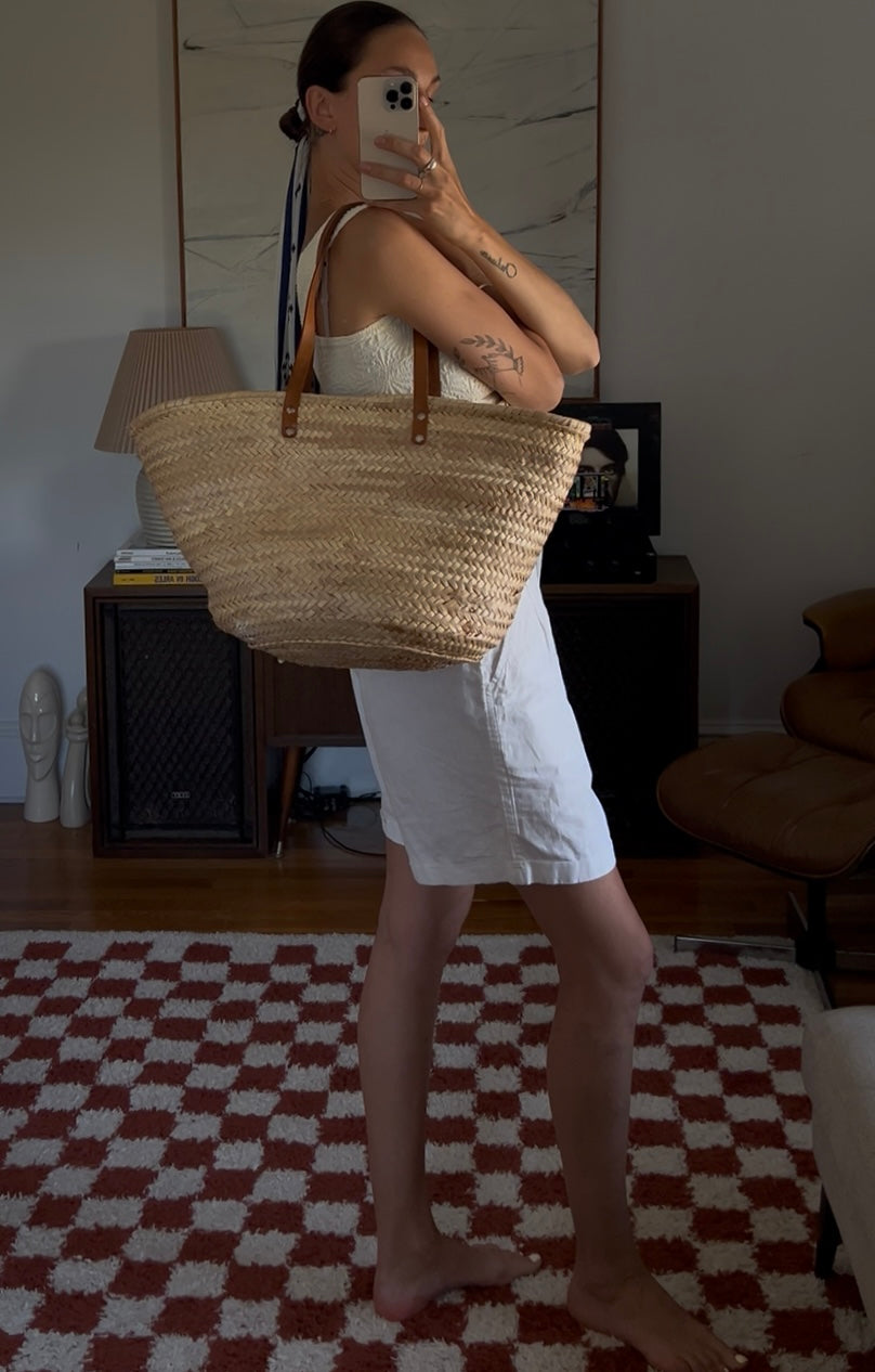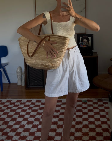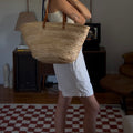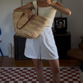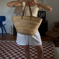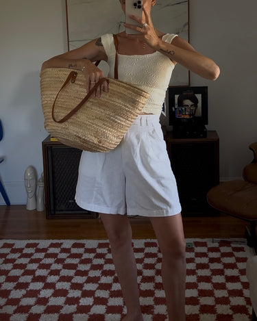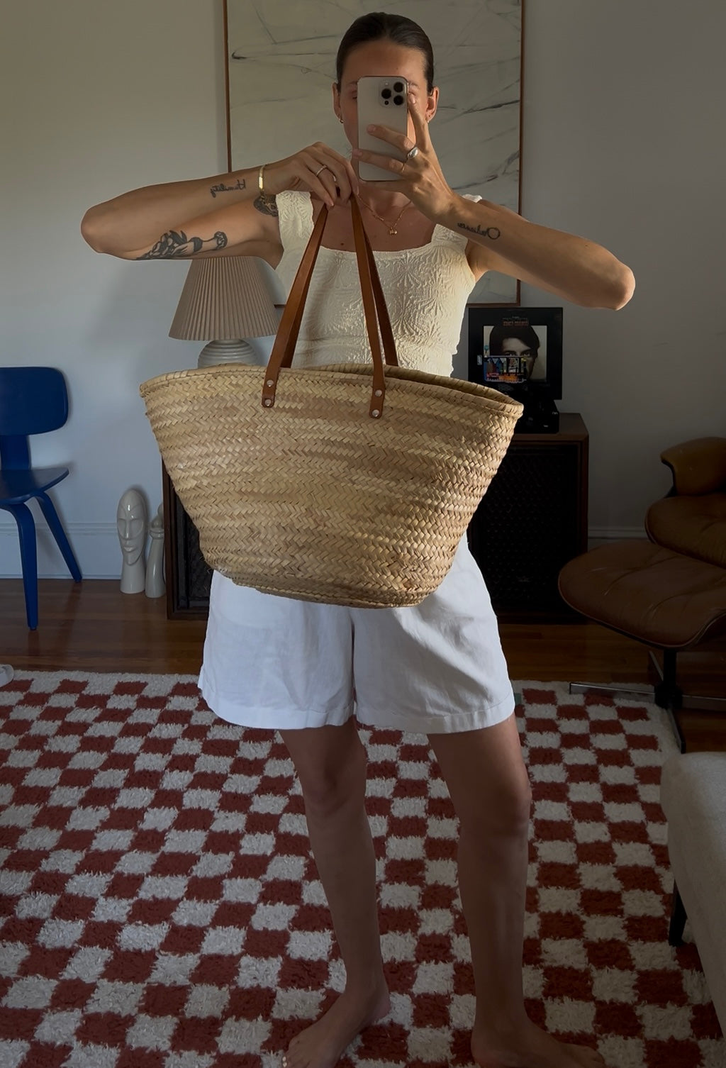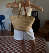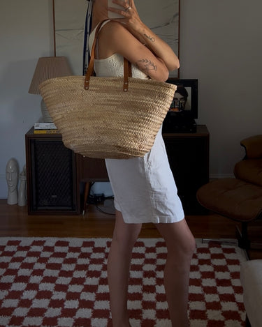 Moroccan made straw tote with long leather handles. Brass rivets. Comfortable and versatile.