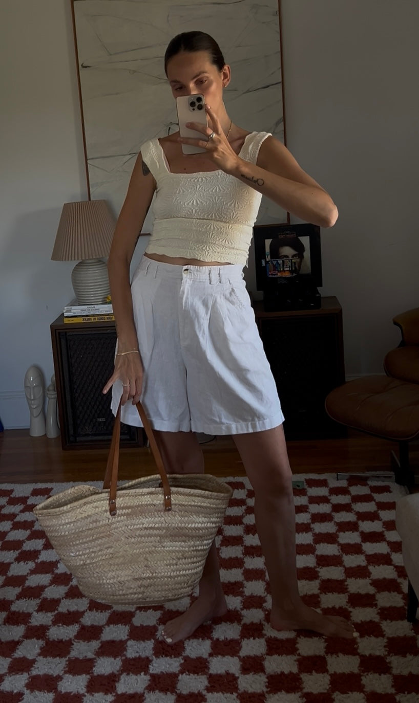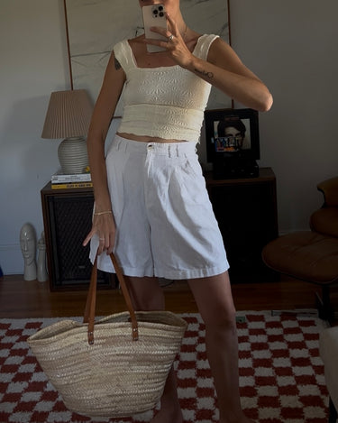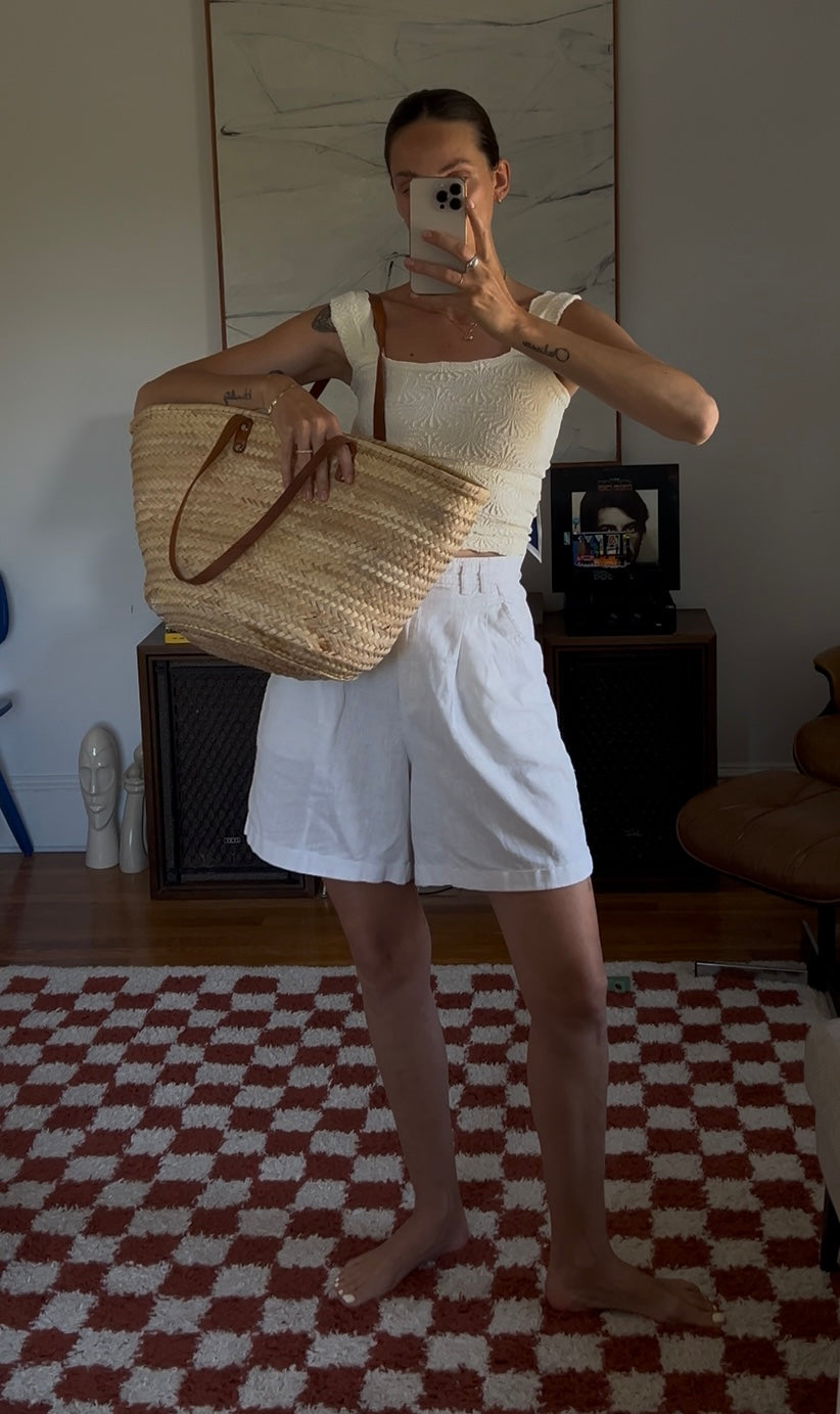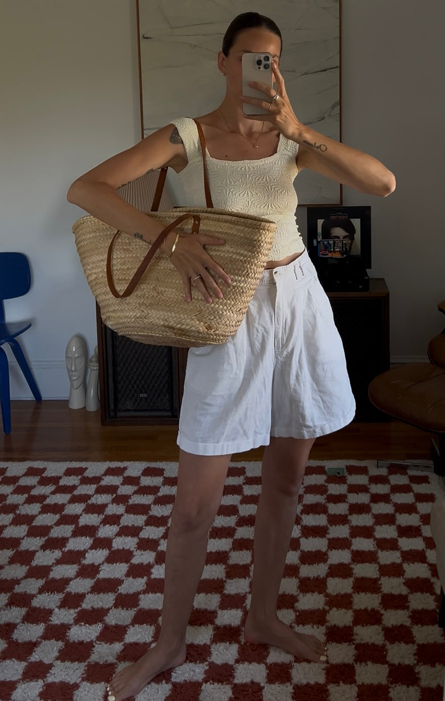 Moroccan made straw tote with long leather handles. Brass rivets. Comfortable and versatile.