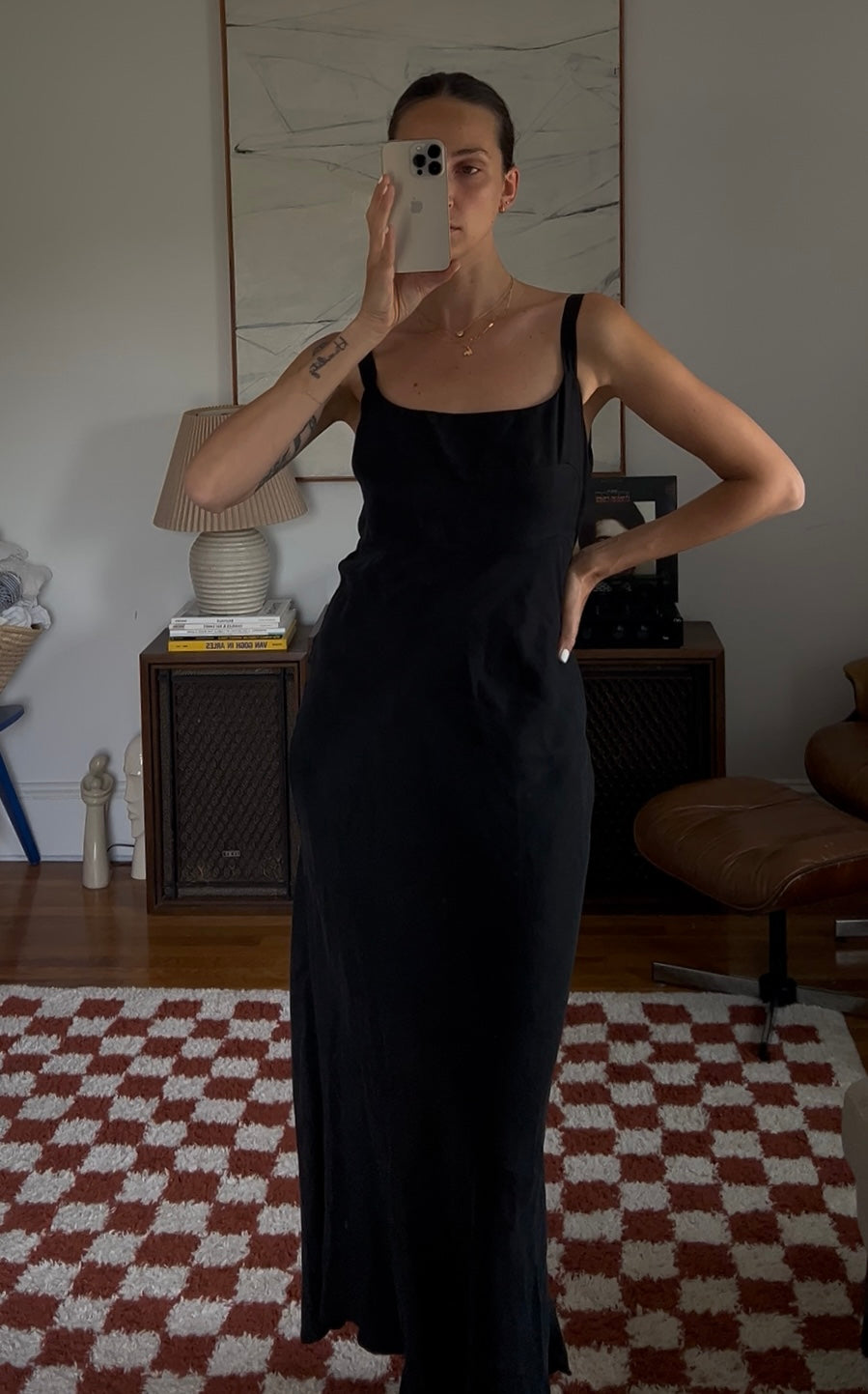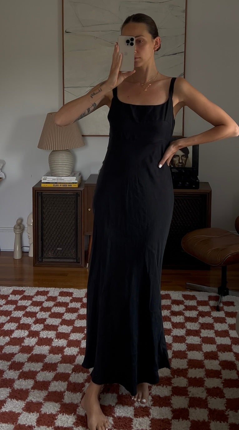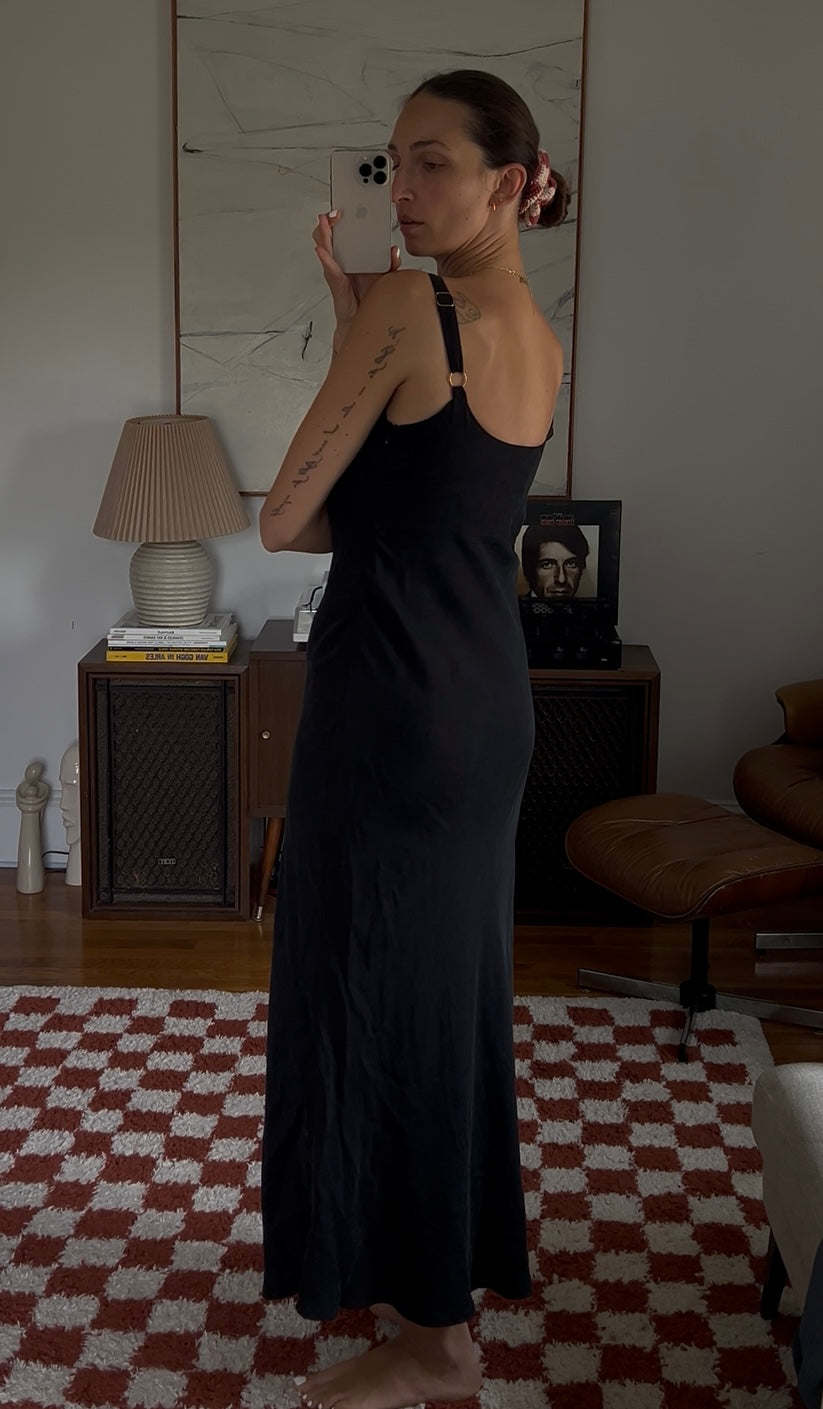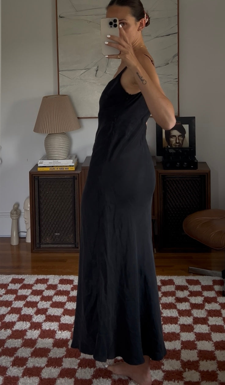 A stunning silk like material that is buttery and soft with adjustable strap and a classic flattering neckline. Tapered of the waist and bias cut hem.