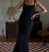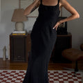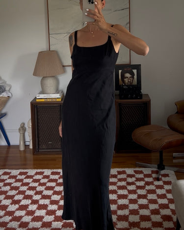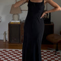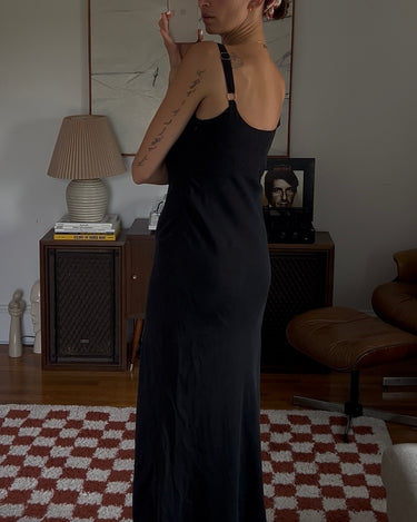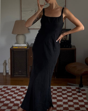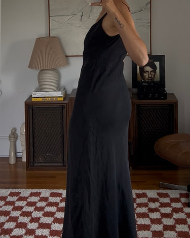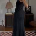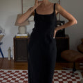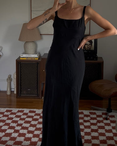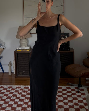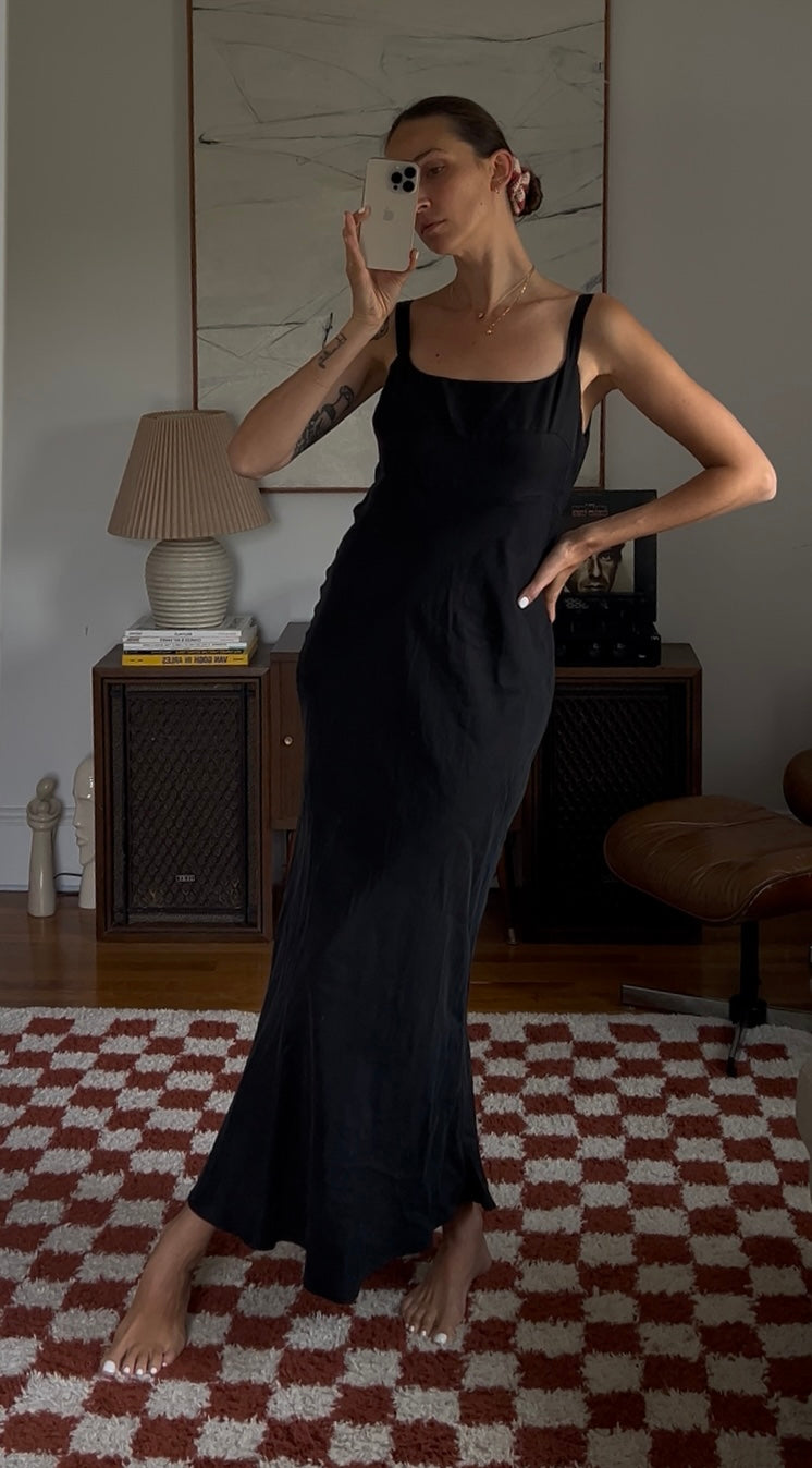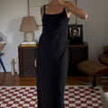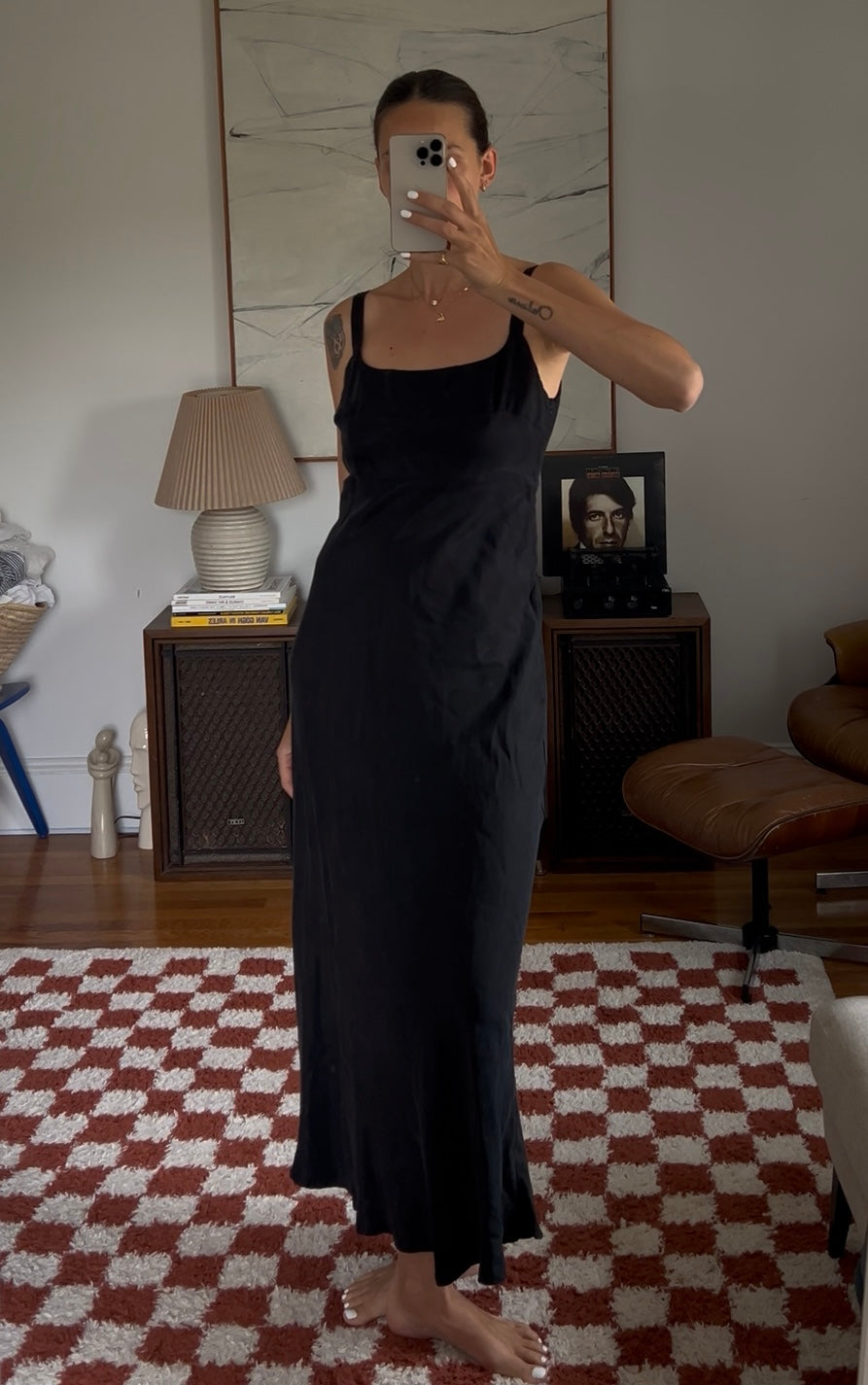 A stunning silk like material that is buttery and soft with adjustable strap and a classic flattering neckline. Tapered of the waist and bias cut hem.