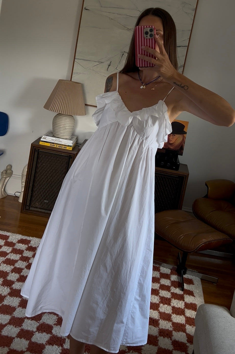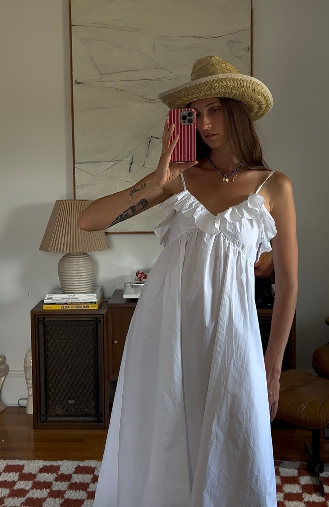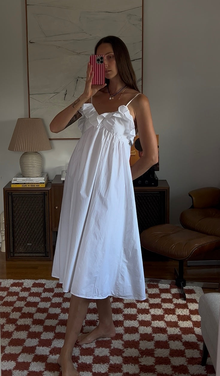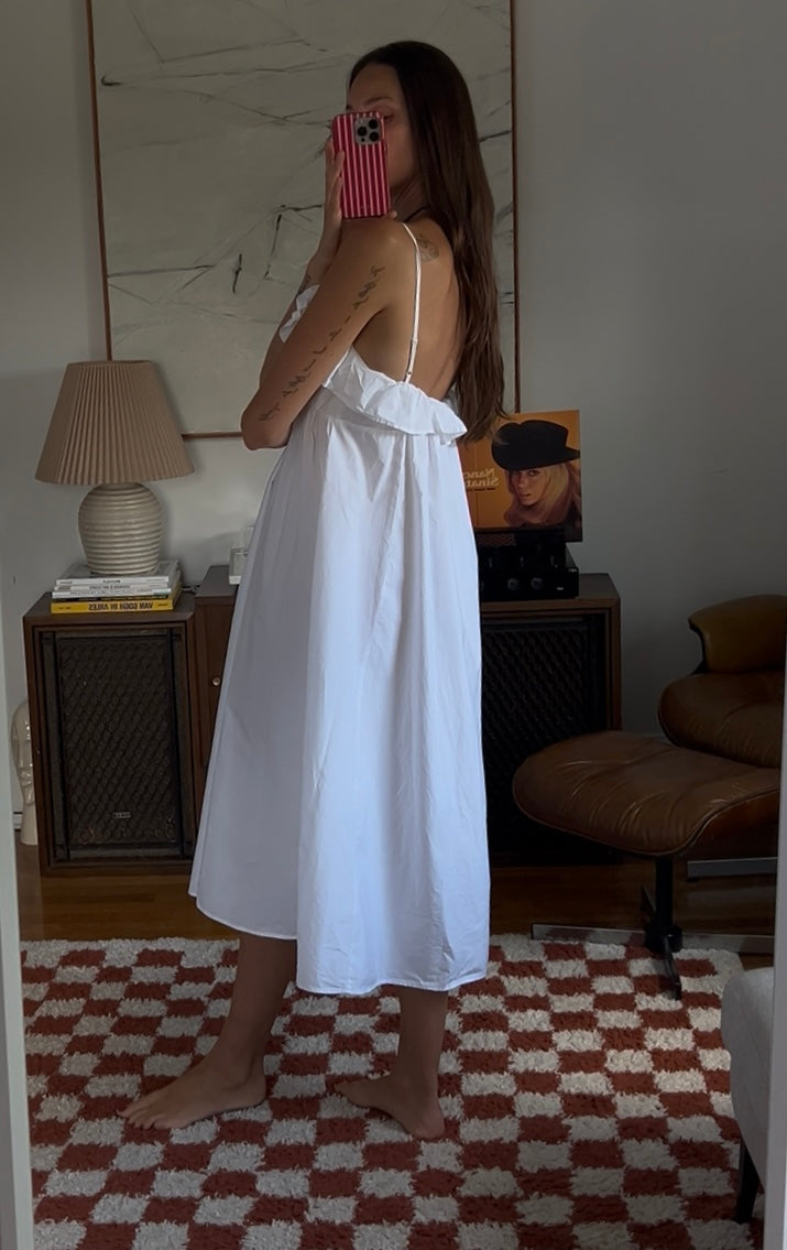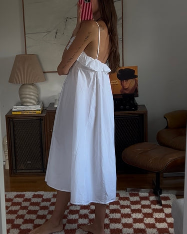 a crisp and stunning poplin dress with thin strap, low back and ruffle on neckline. Back of the dress is elastic so there is so flexibility with sizing