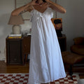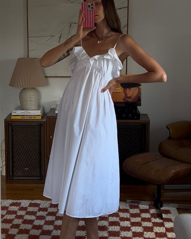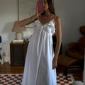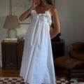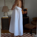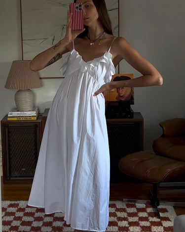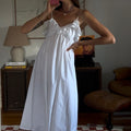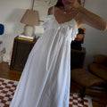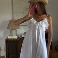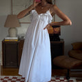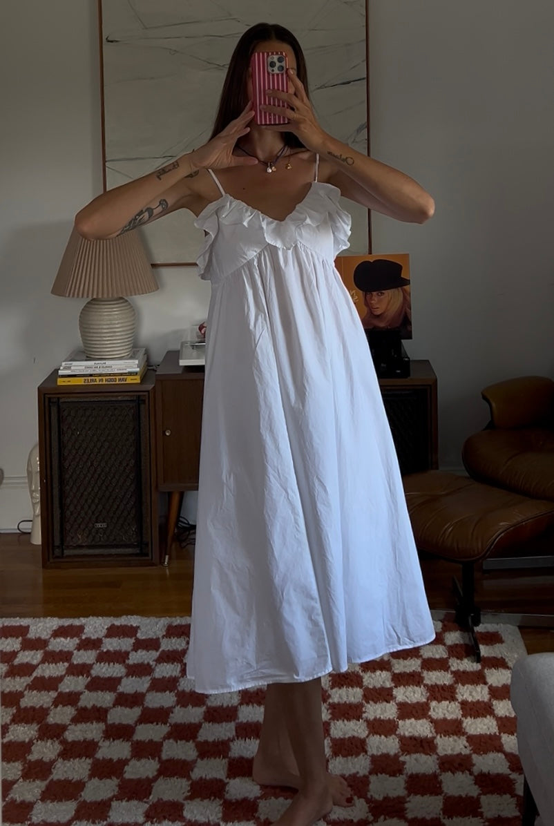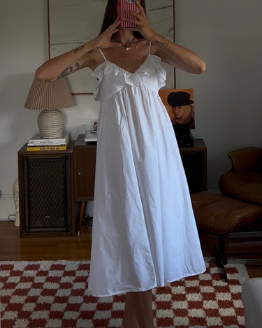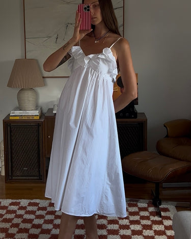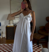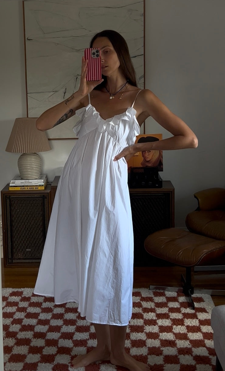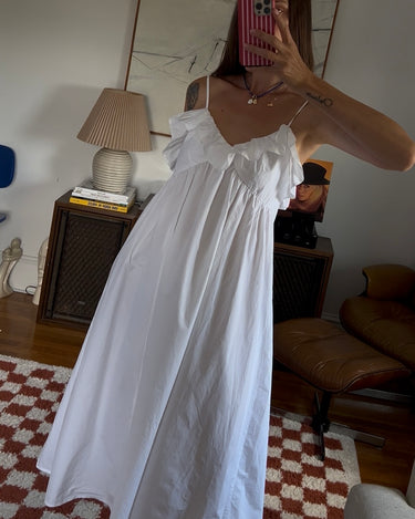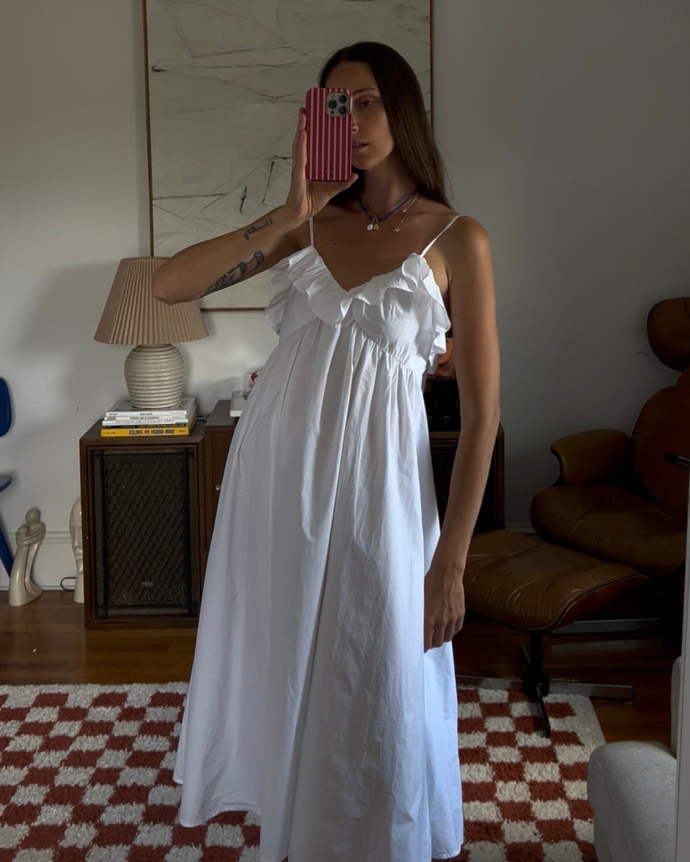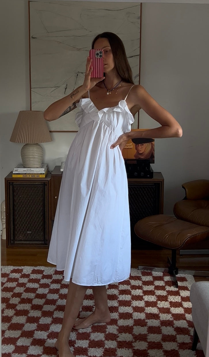 a crisp and stunning poplin dress with thin strap, low back and ruffle on neckline. Back of the dress is elastic so there is so flexibility with sizing