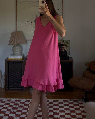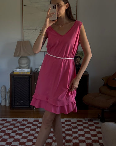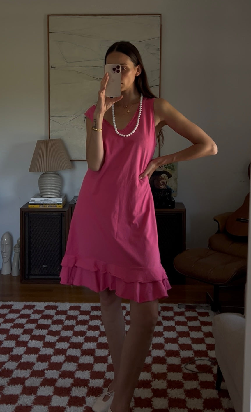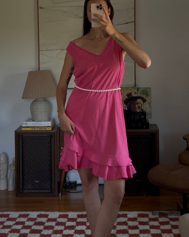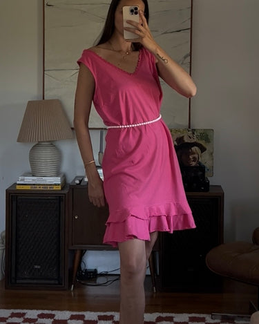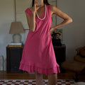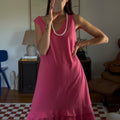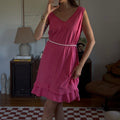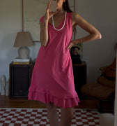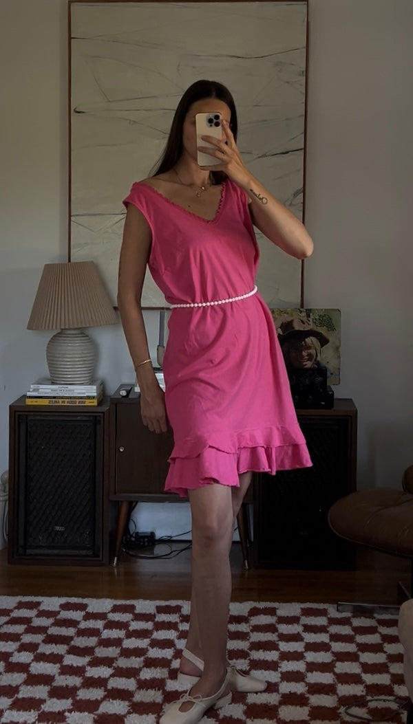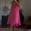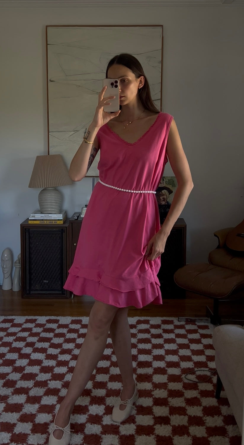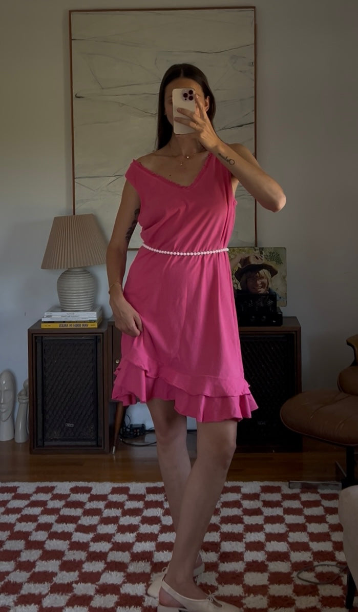 Vibrant pink midi dress with a double ruffle layer. Showed styled with a beaded necklace as a belt.