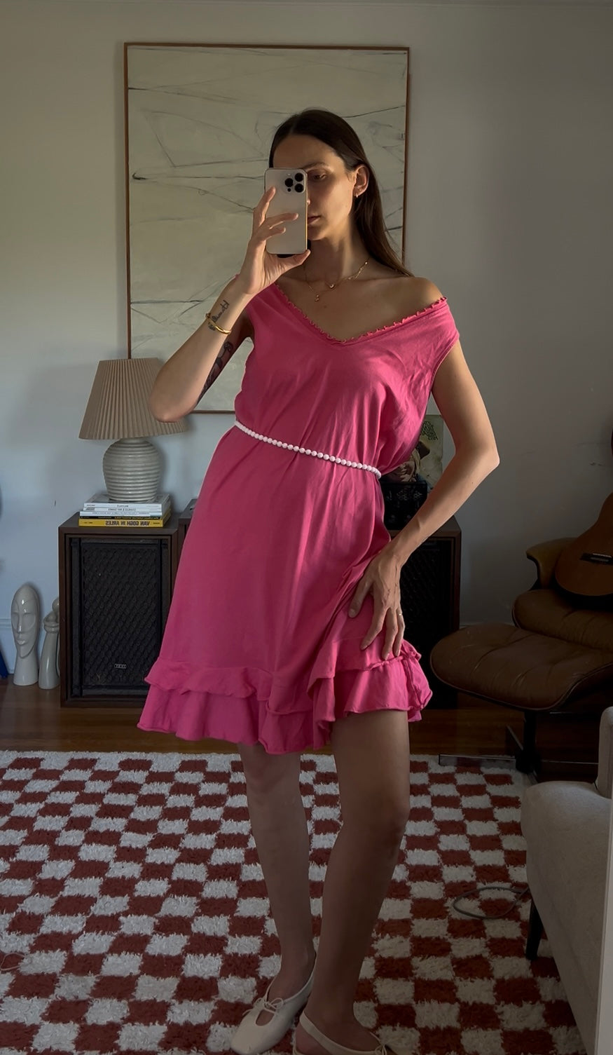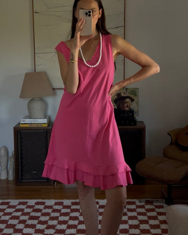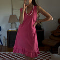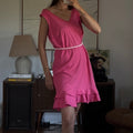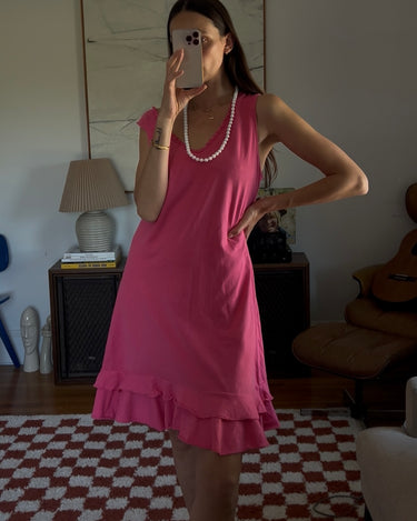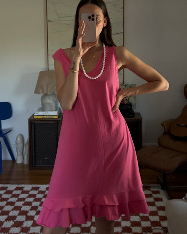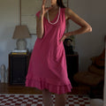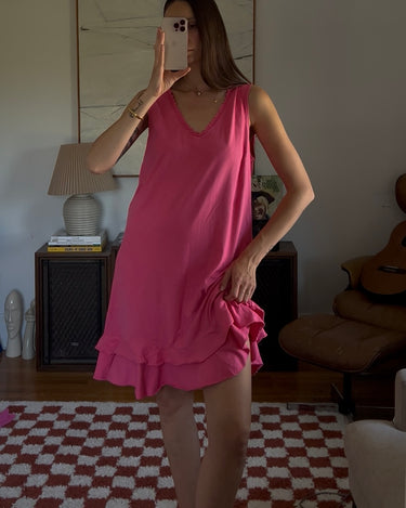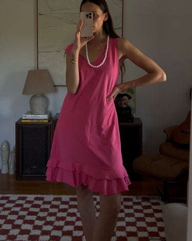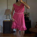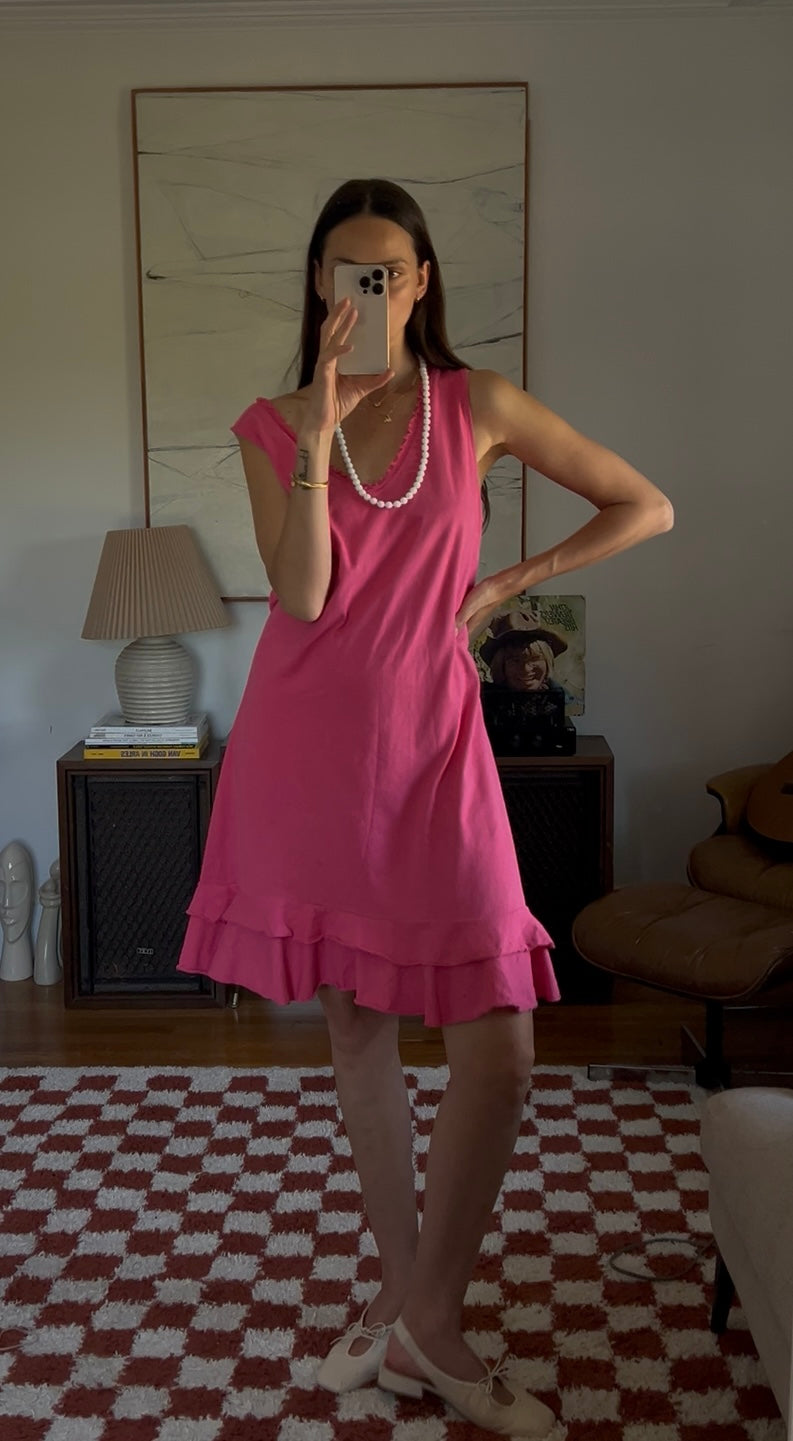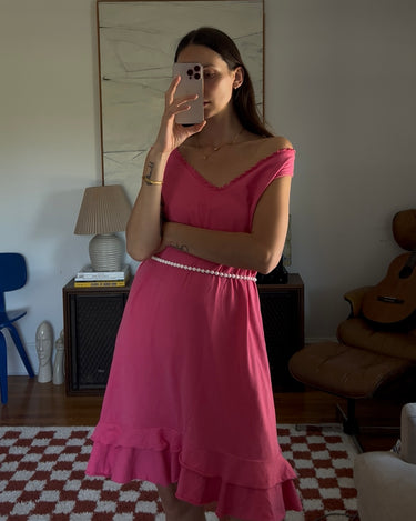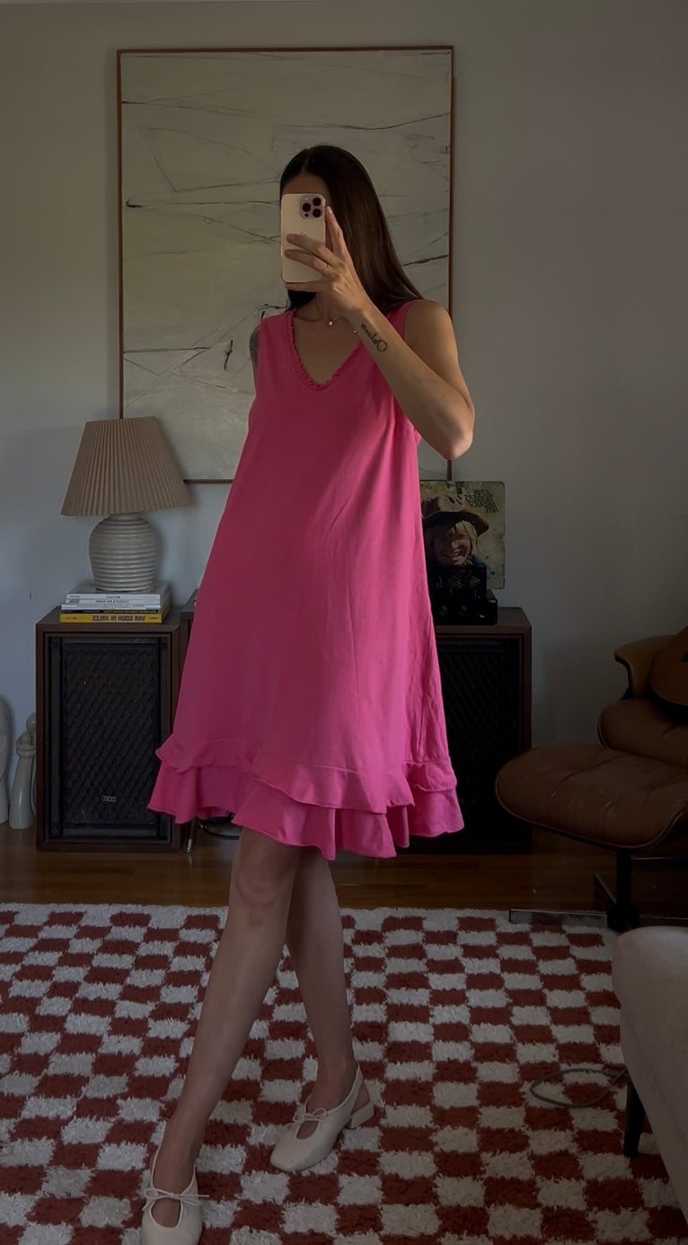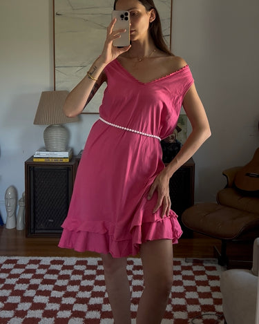 Vibrant pink midi dress with a double ruffle layer. Showed styled with a beaded necklace as a belt.