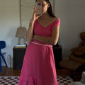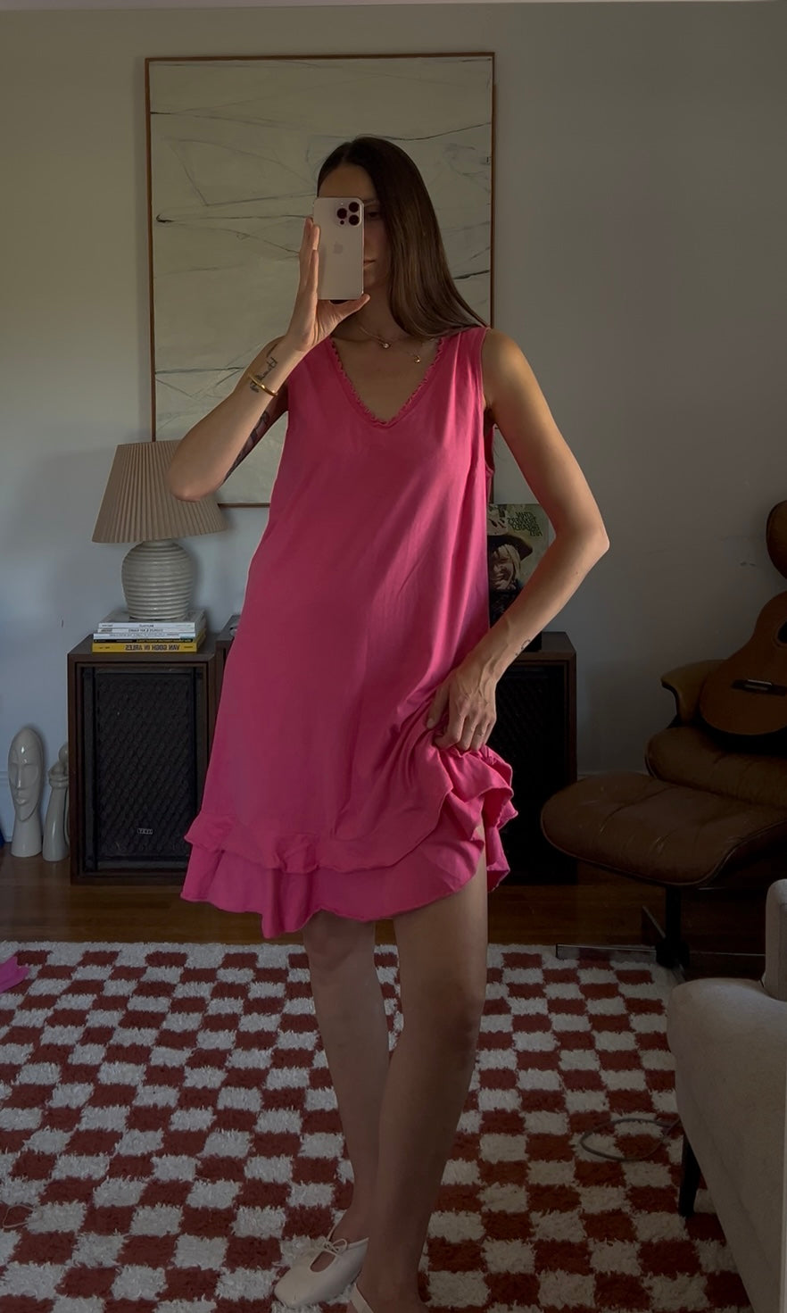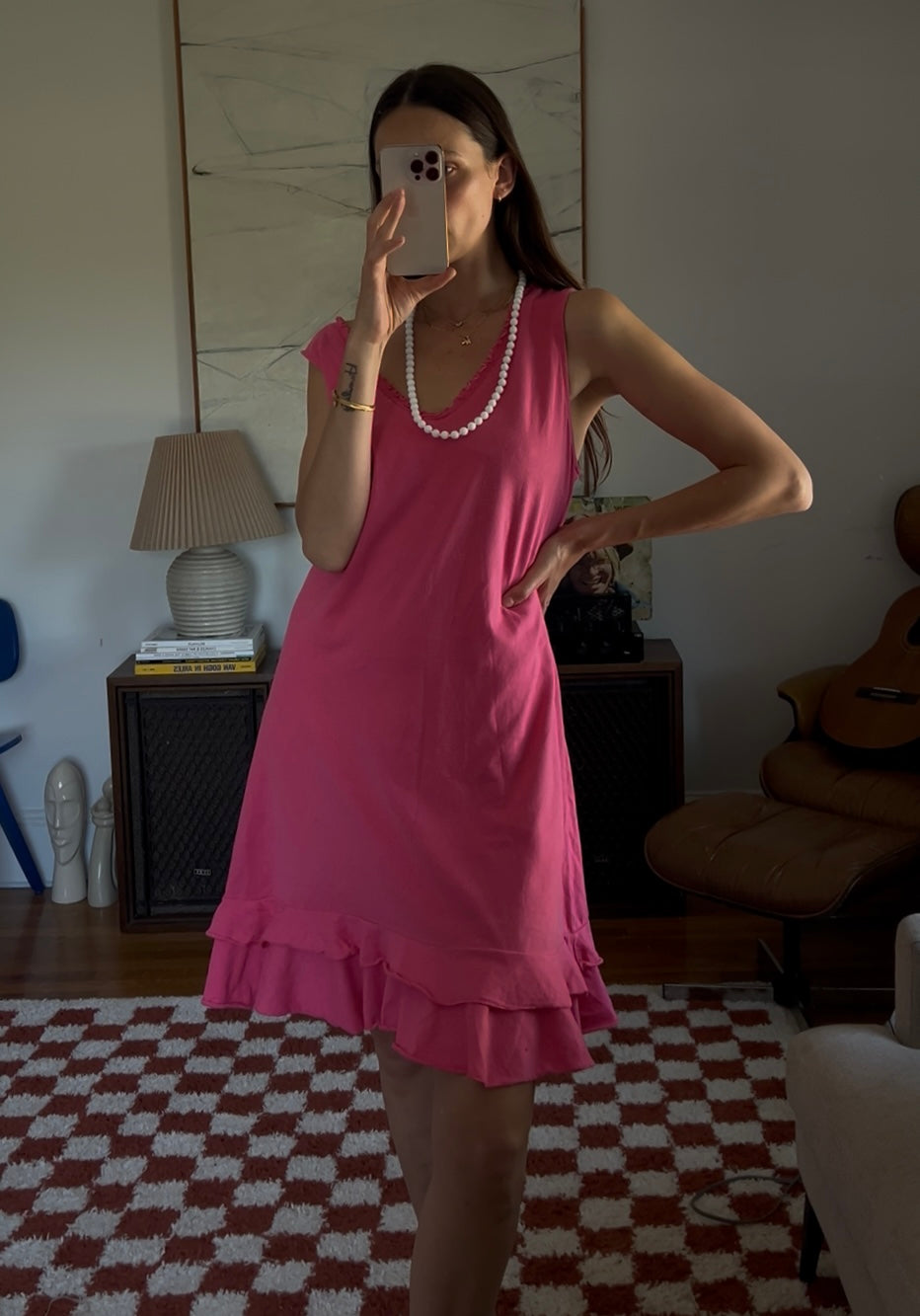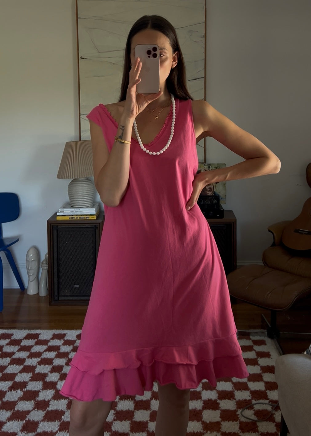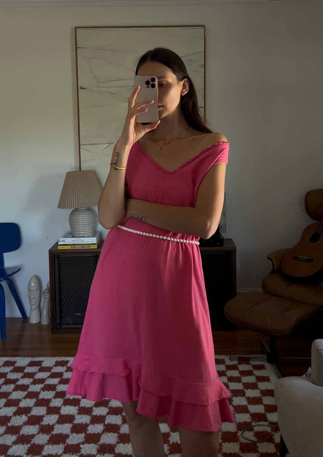 Vibrant pink midi dress with a double ruffle layer. Showed styled with a beaded necklace as a belt.