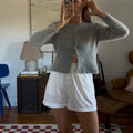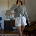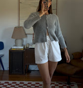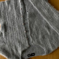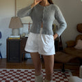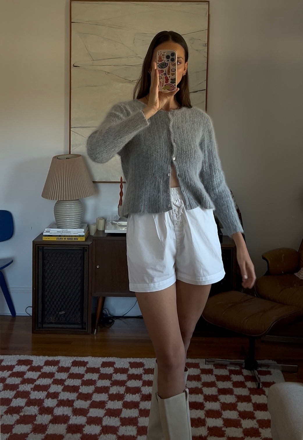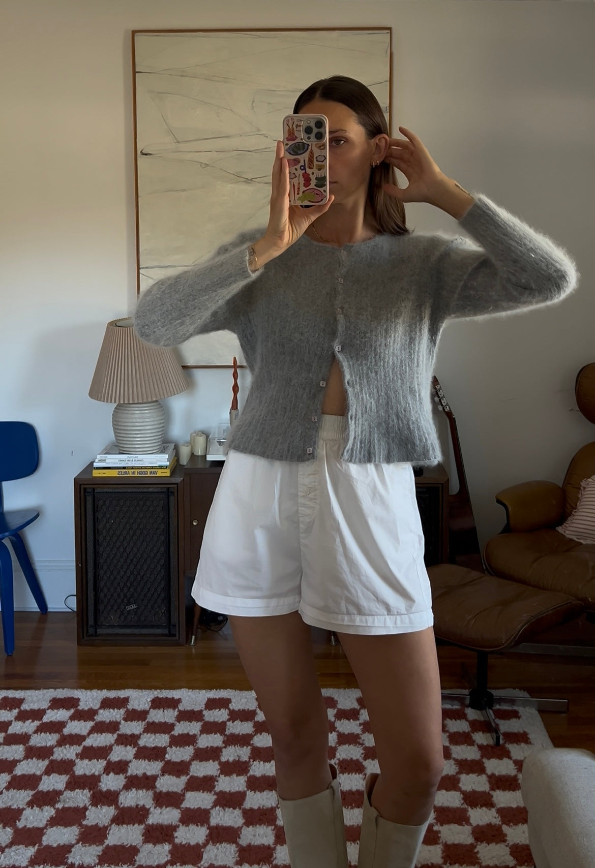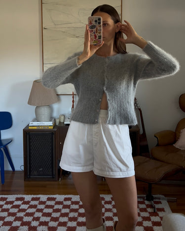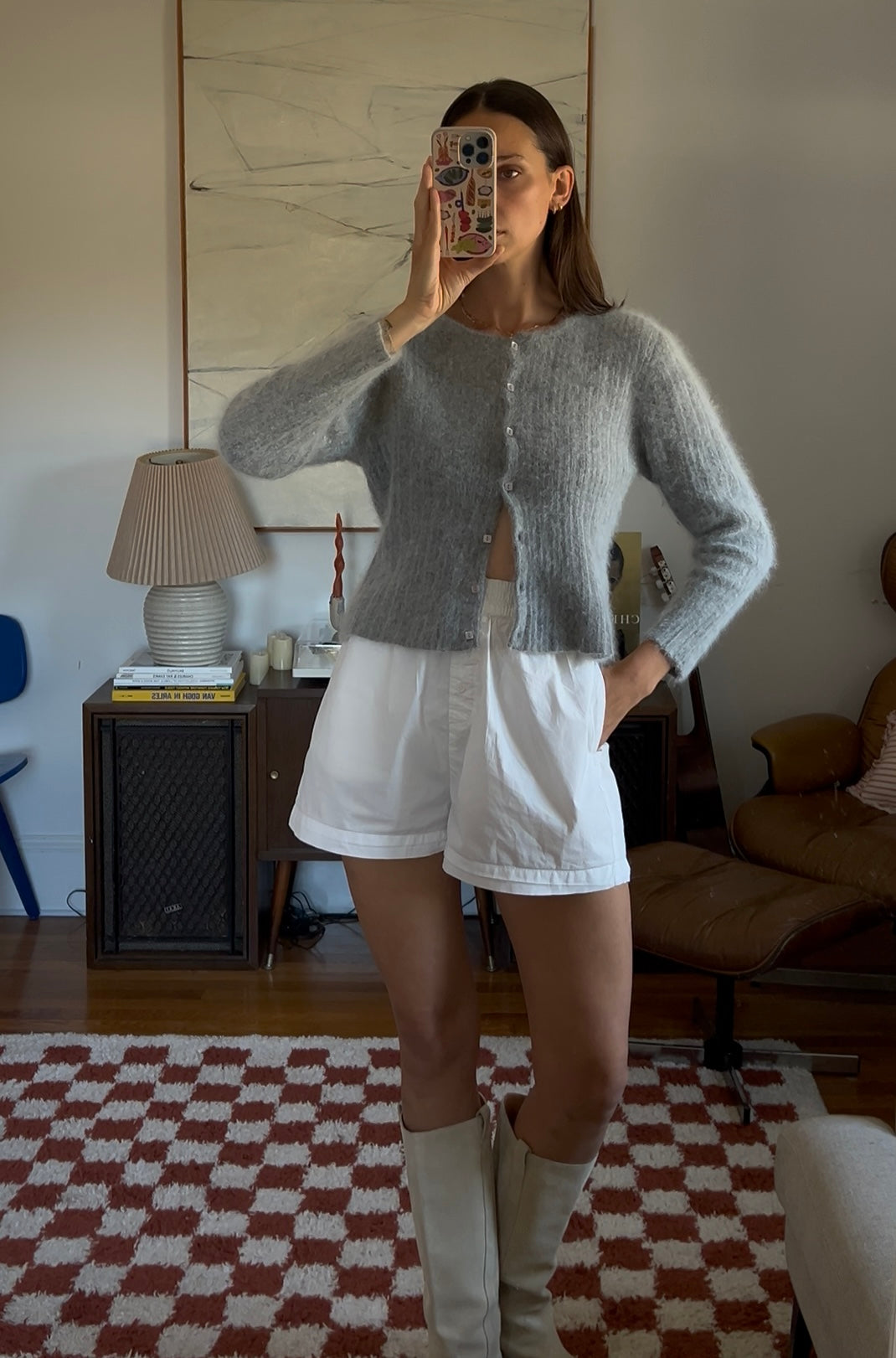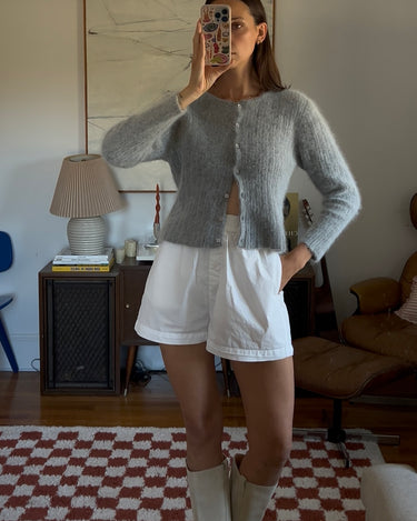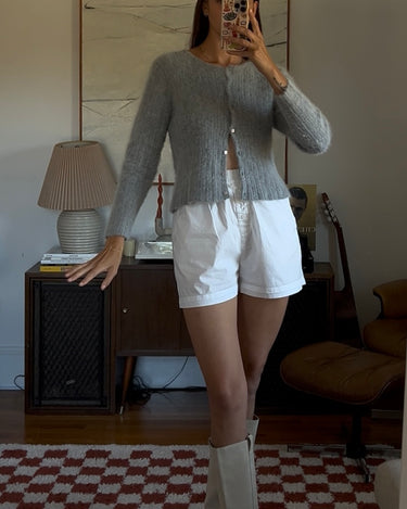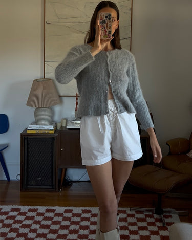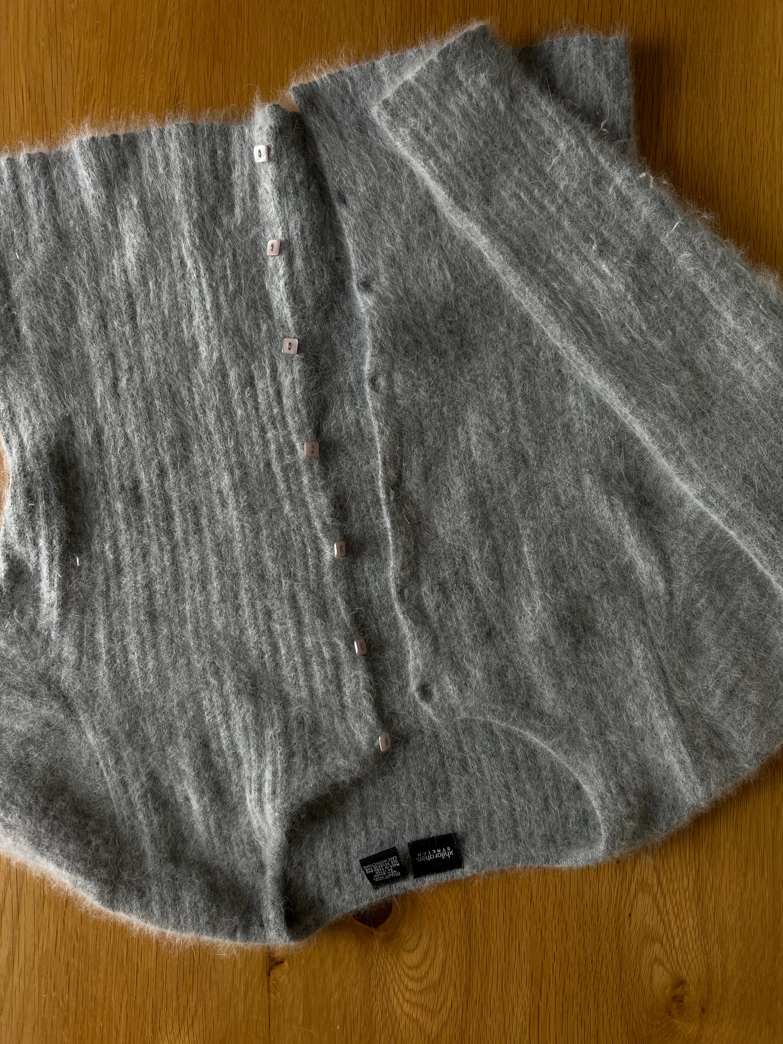 Softest cloud like angora knot with mother of pearl buttons and slightly cropped silhouette.