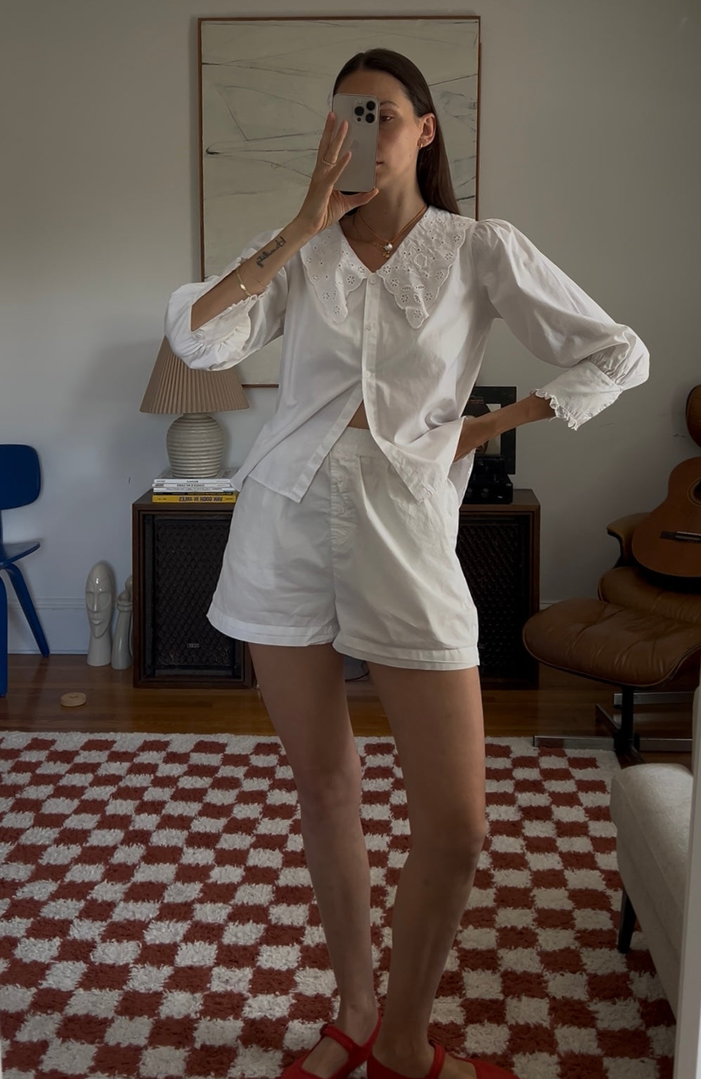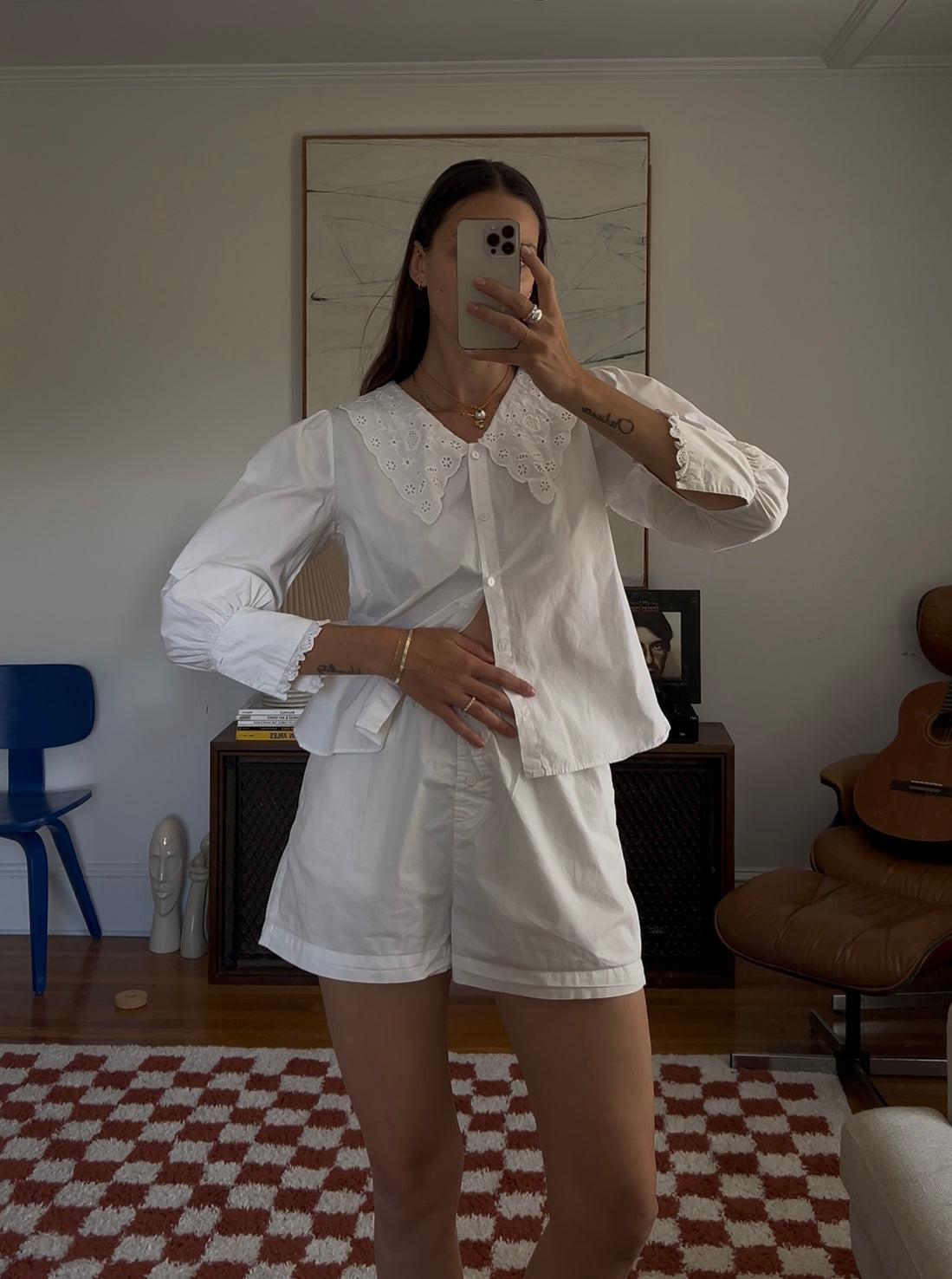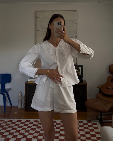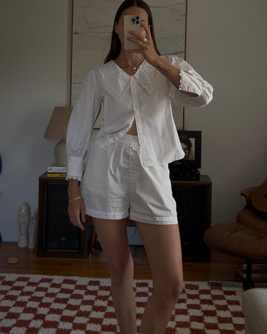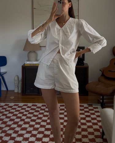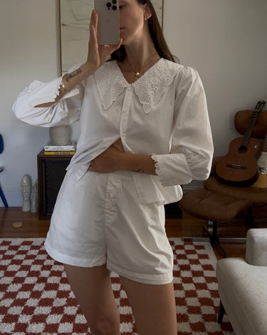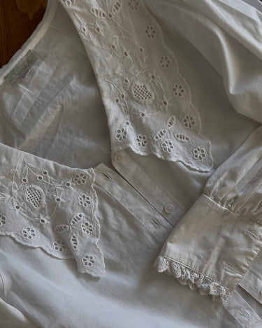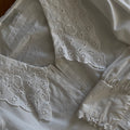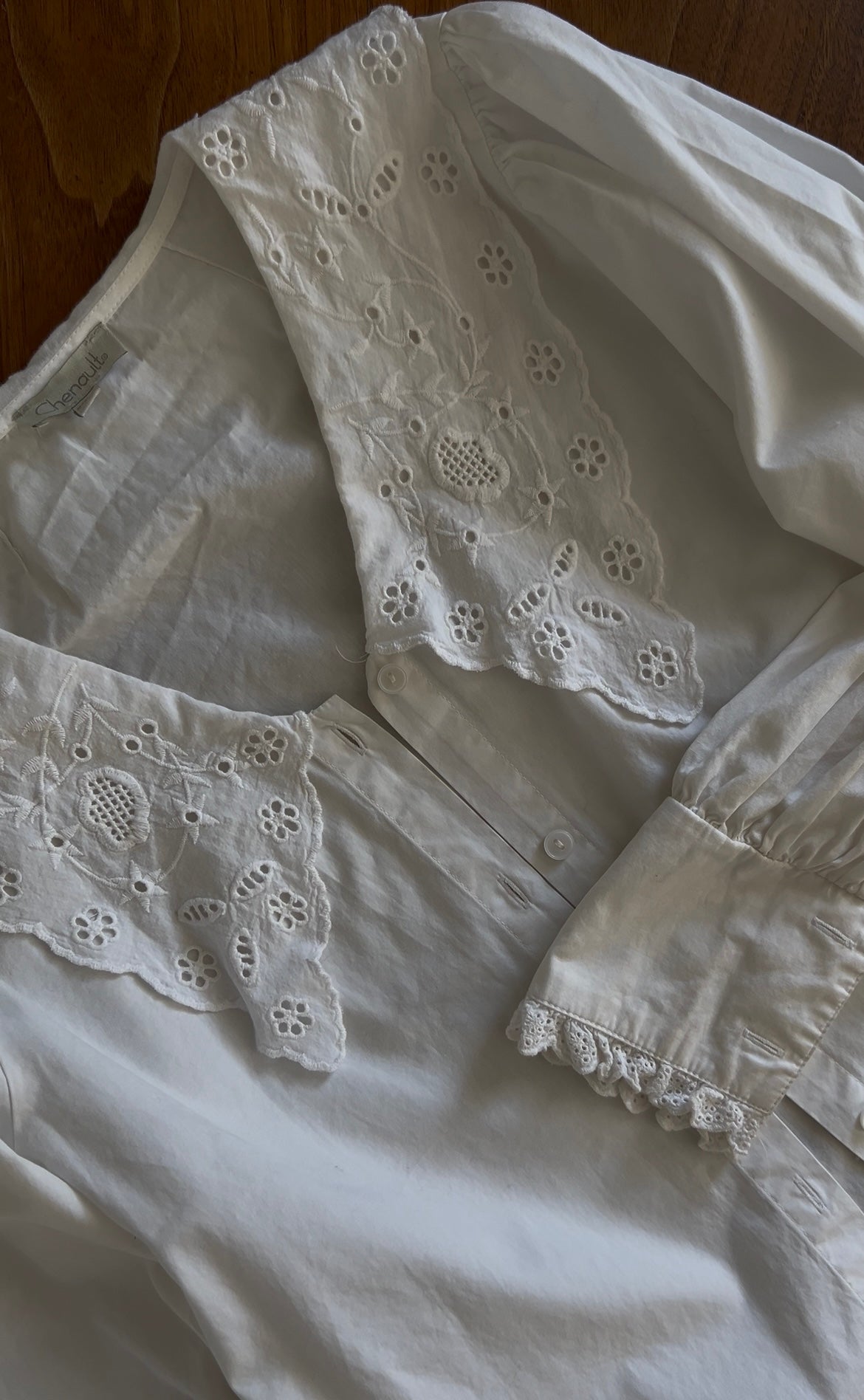 80’s Embrodered collar blouse. Lace trim detailing on sleeve hem and collar.
