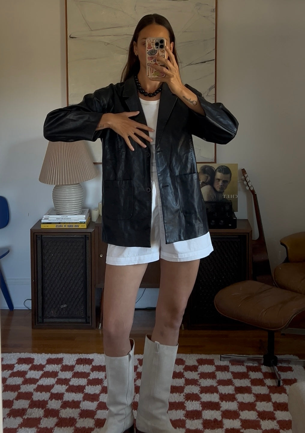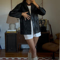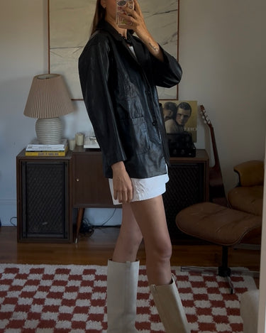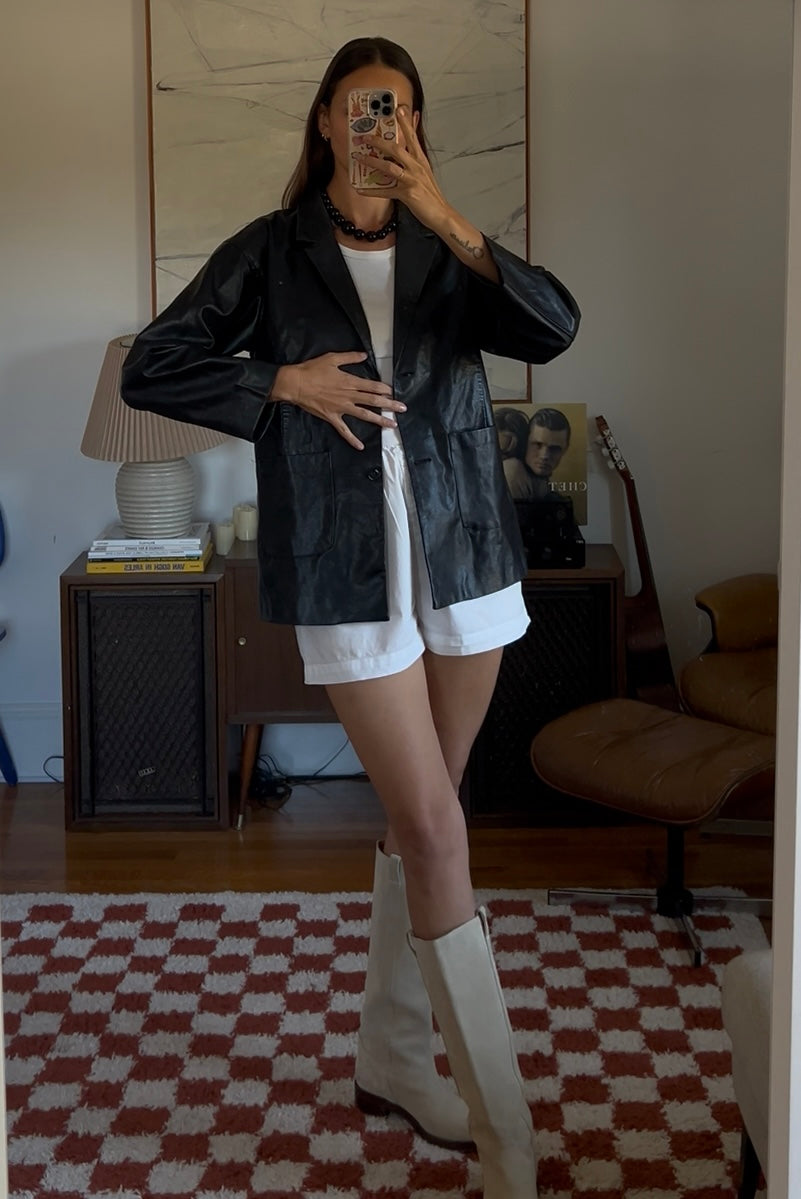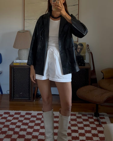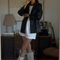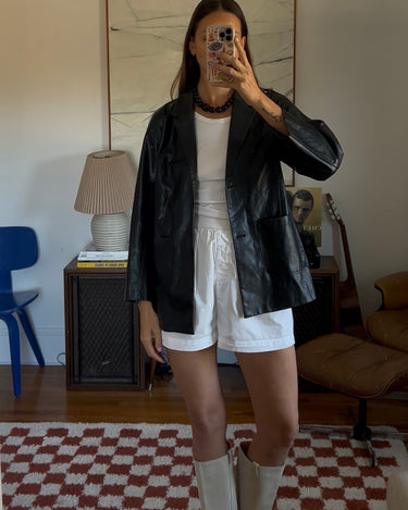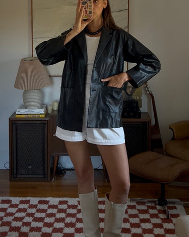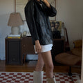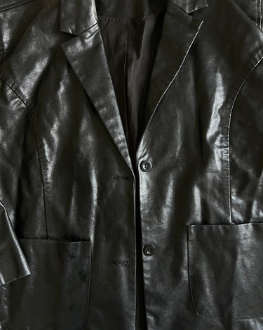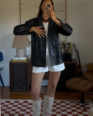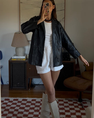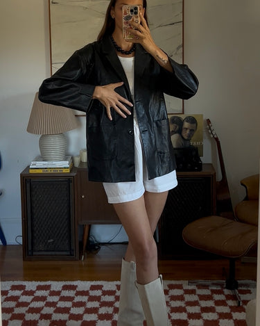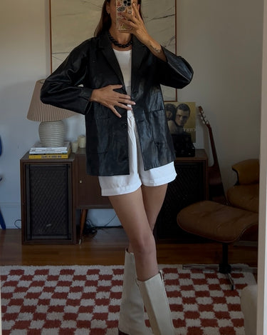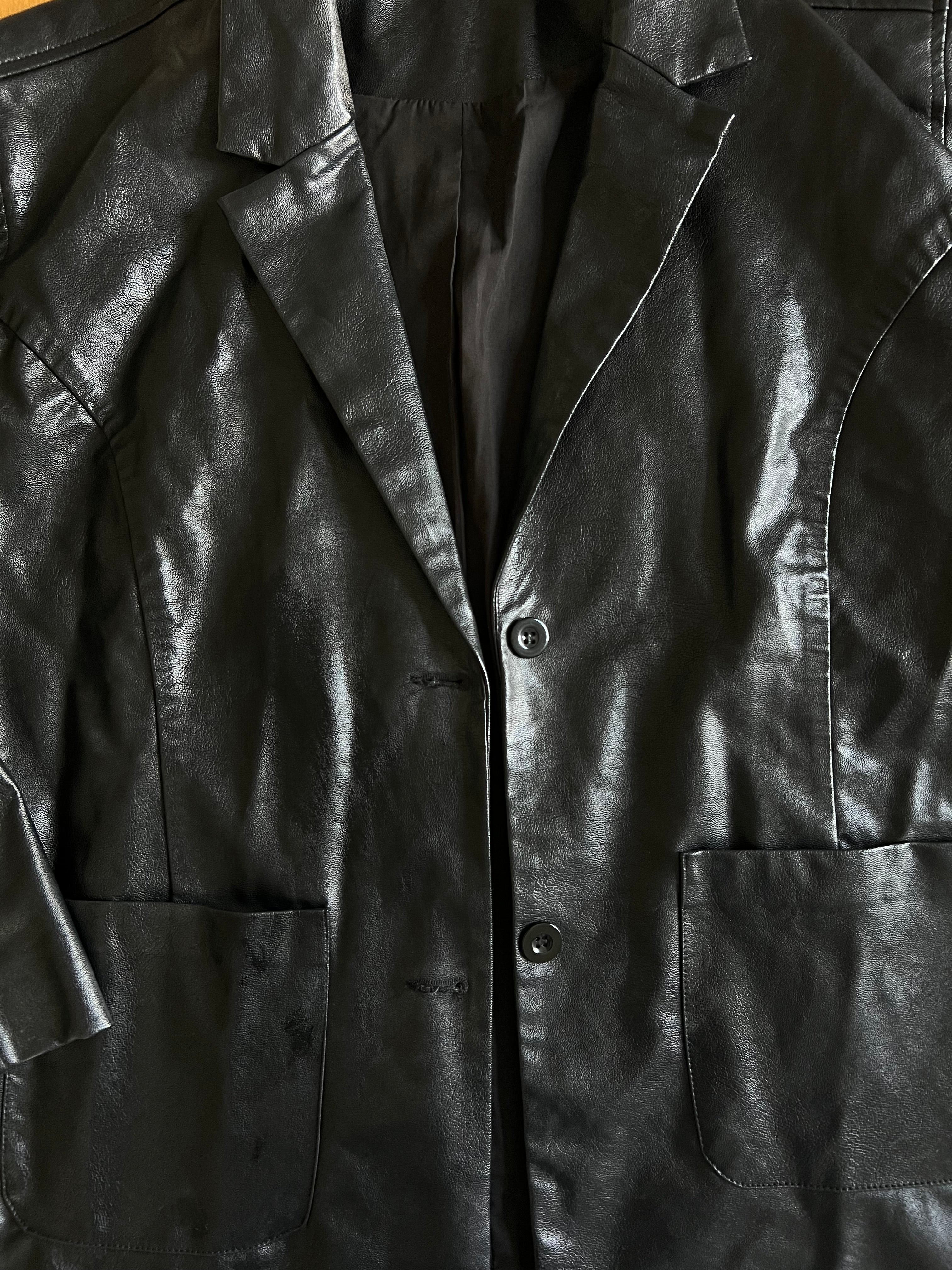 Classic leather jacket in a slightly cropped single button silhouette but faux leather. Get the iconic look but much easier to care for and clean.