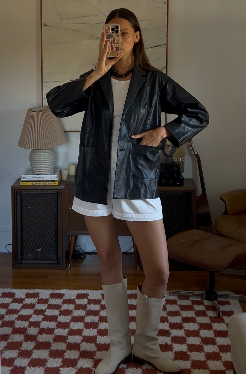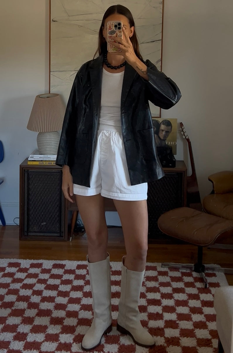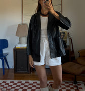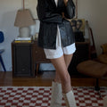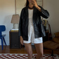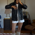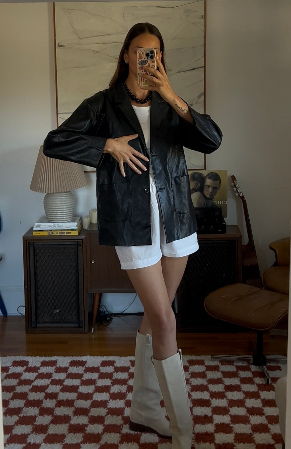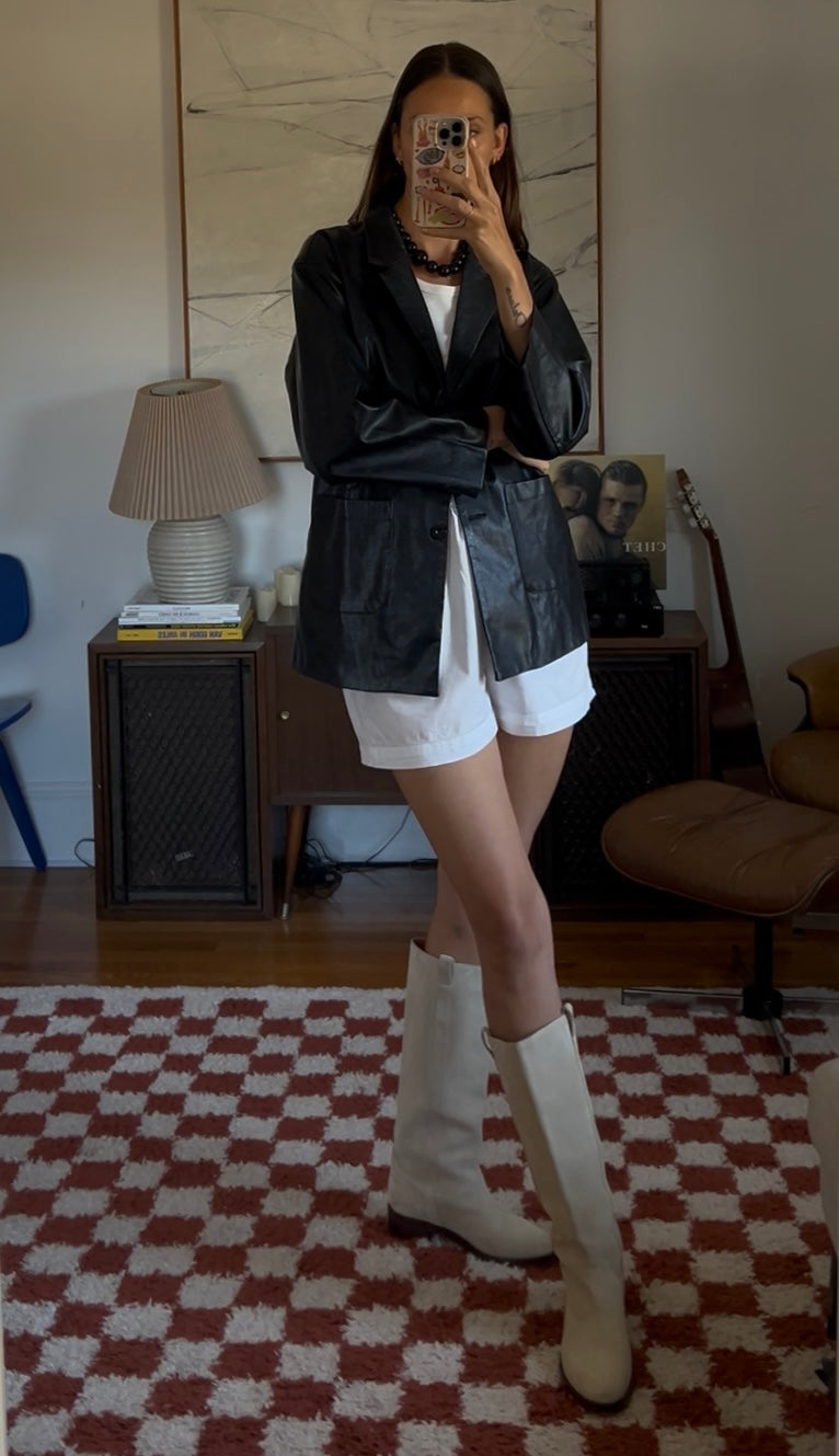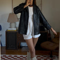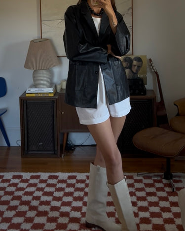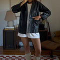 Classic leather jacket in a slightly cropped single button silhouette but faux leather. Get the iconic look but much easier to care for and clean.