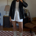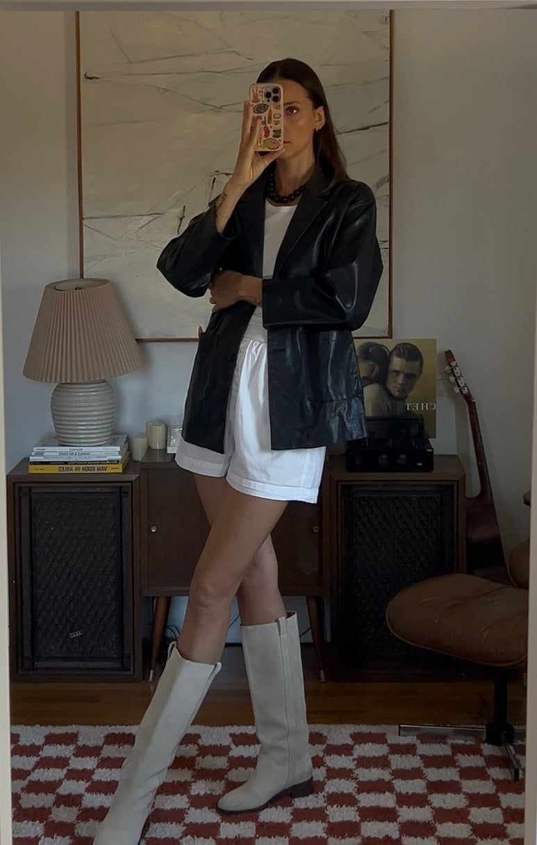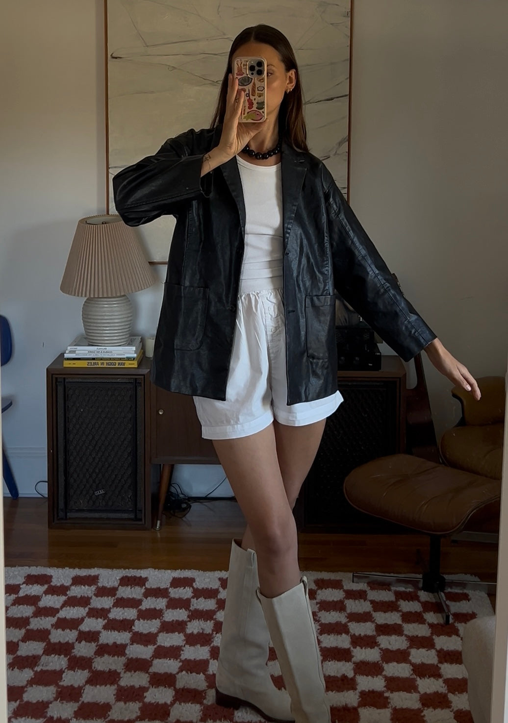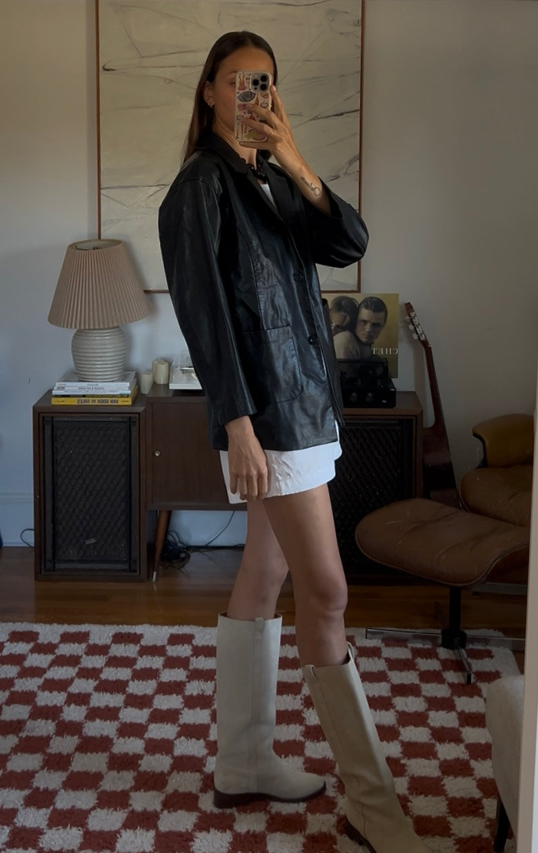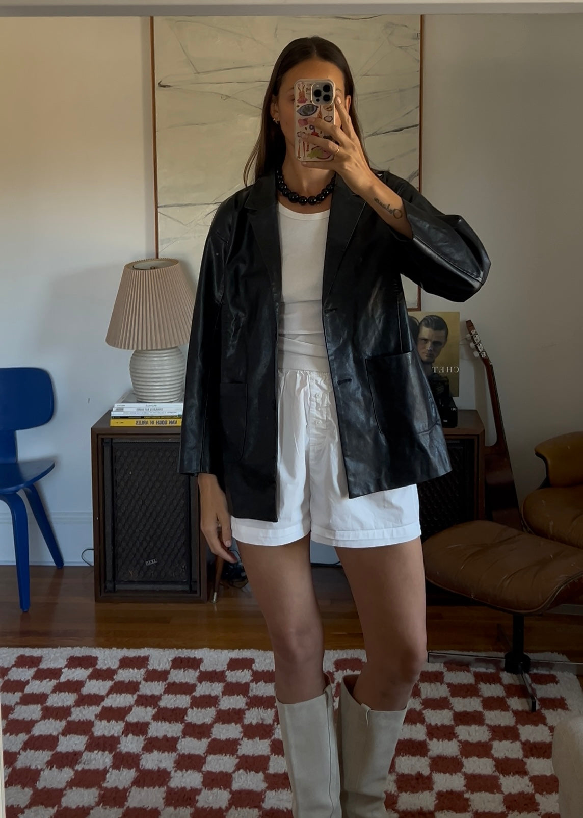 Classic leather jacket in a slightly cropped single button silhouette but faux leather. Get the iconic look but much easier to care for and clean.