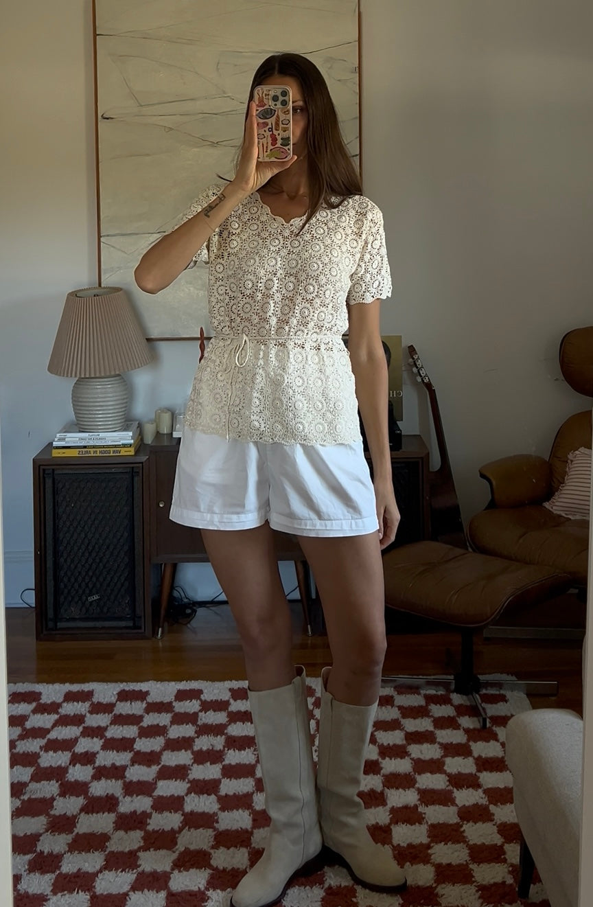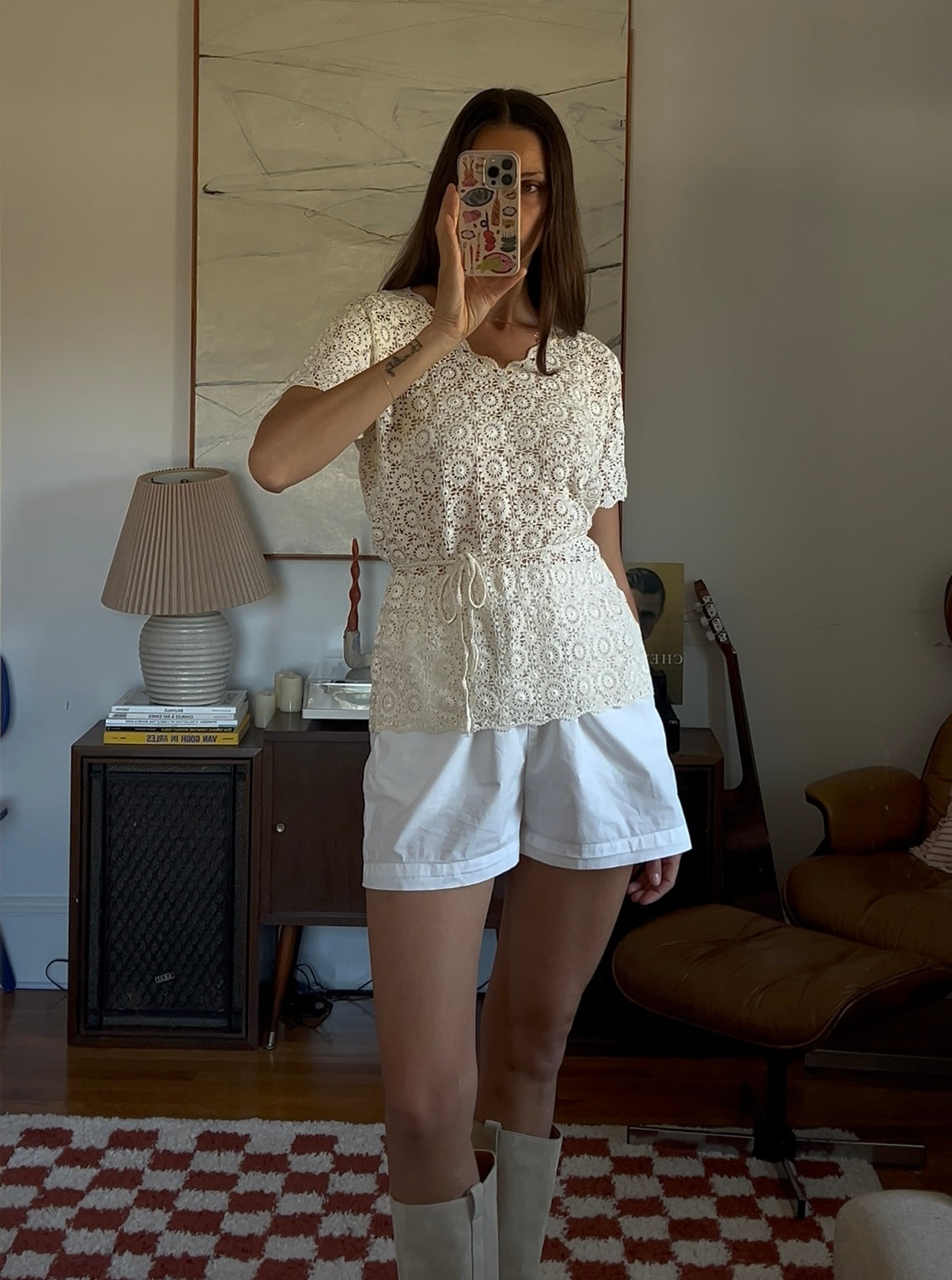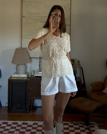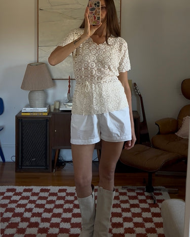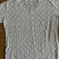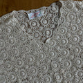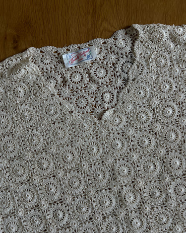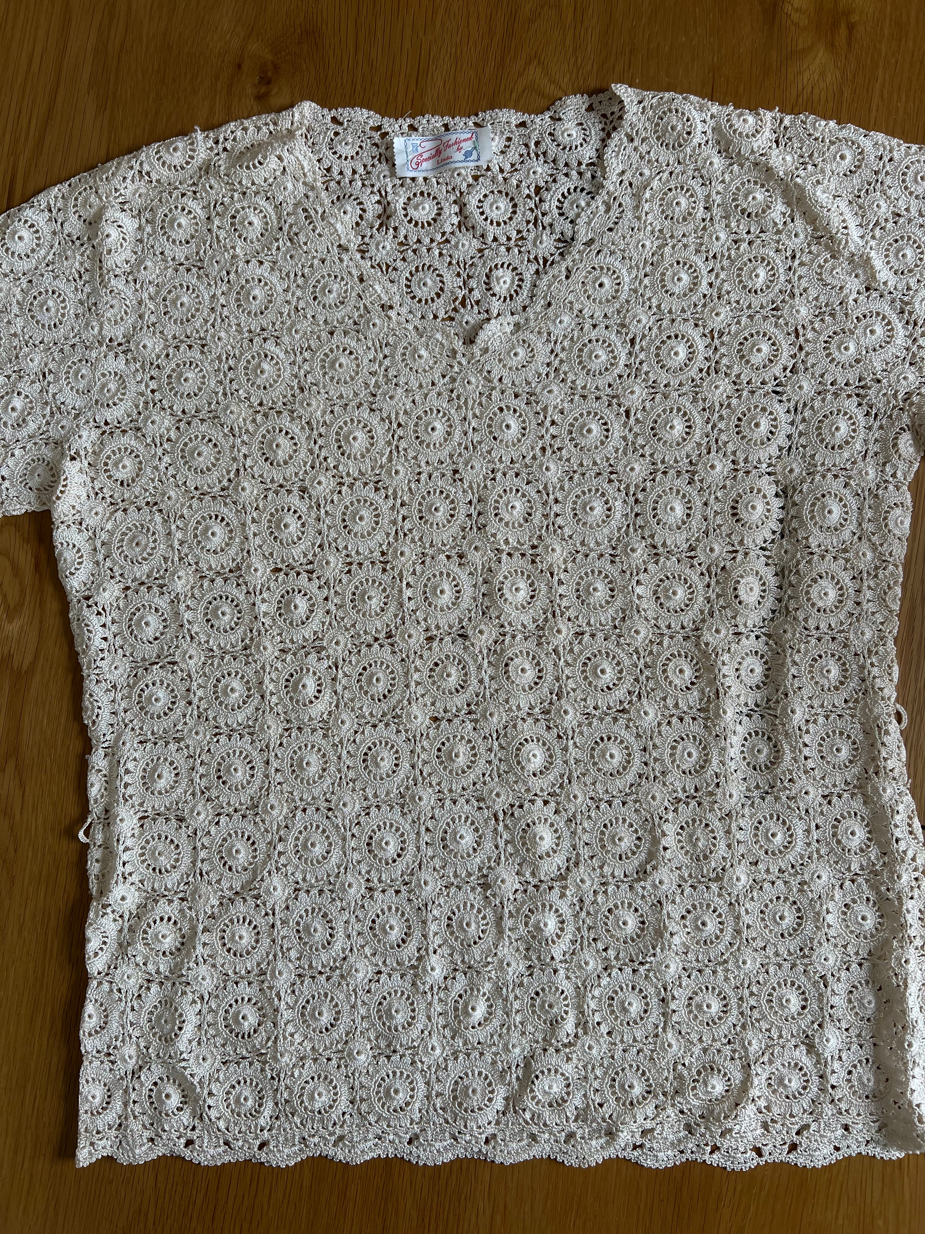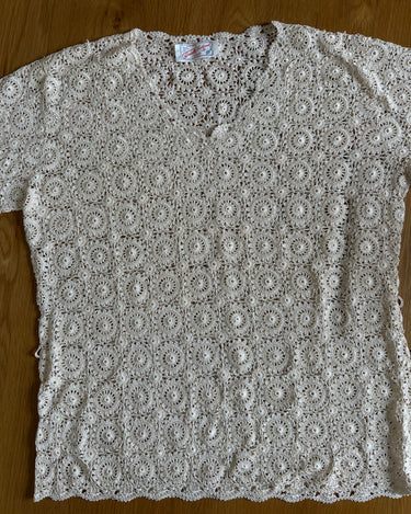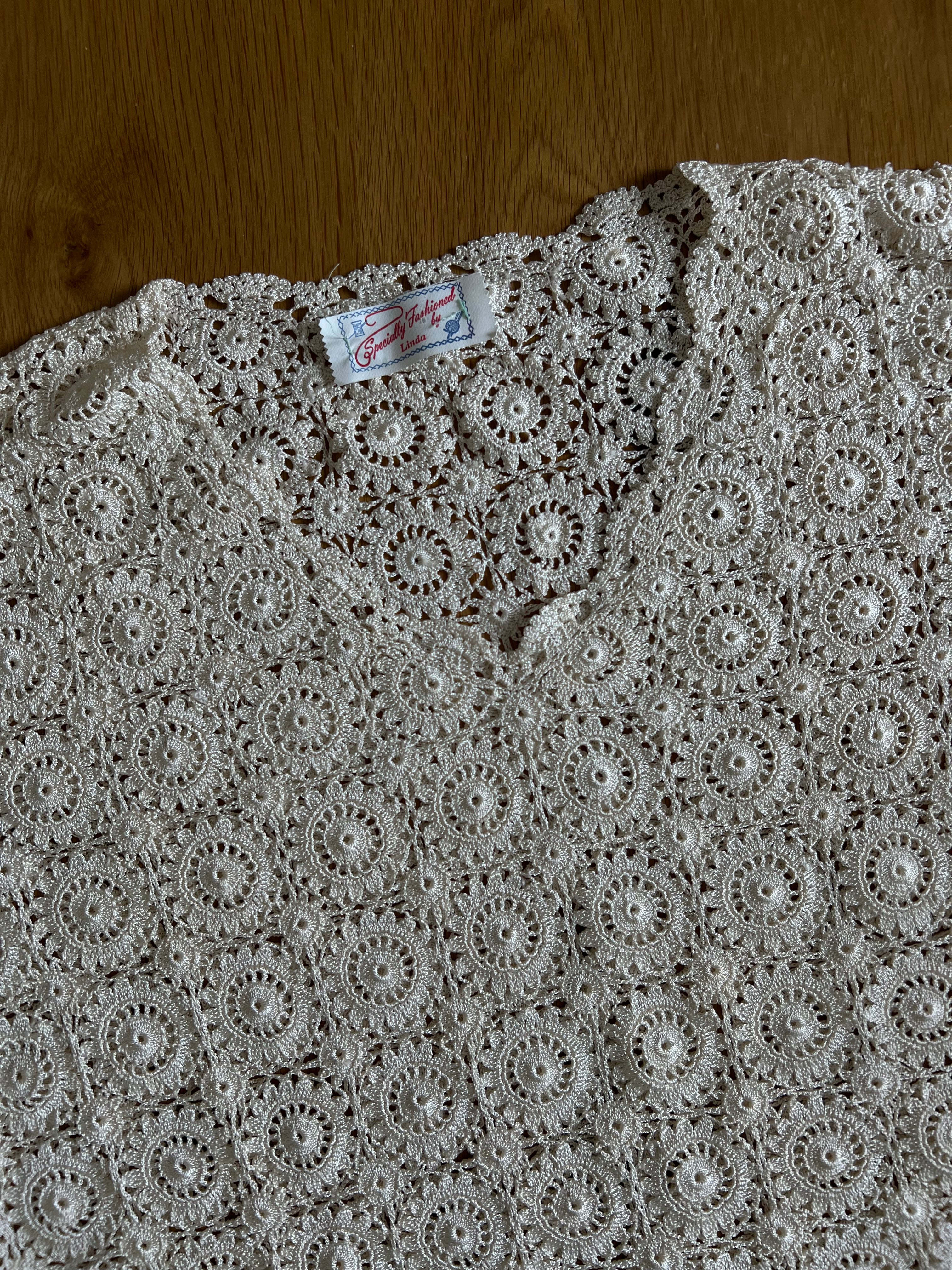 Ornate crochet with hand sewn tag and a tie belt. Unique, stunning and fun to style.