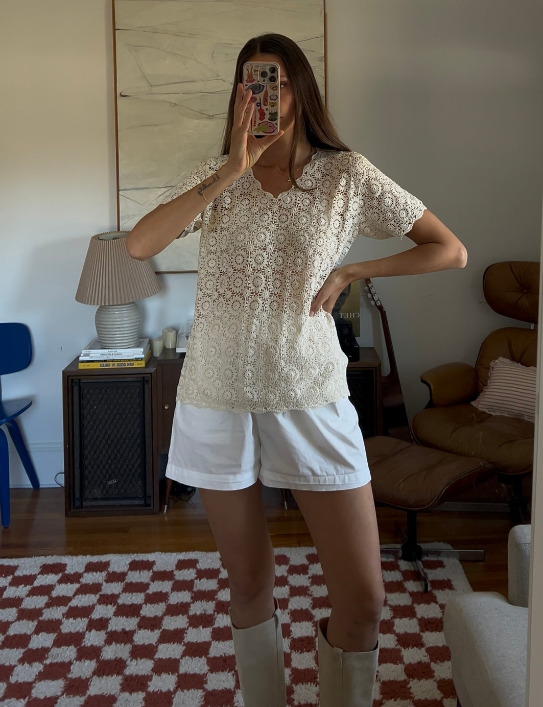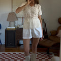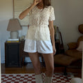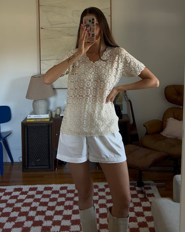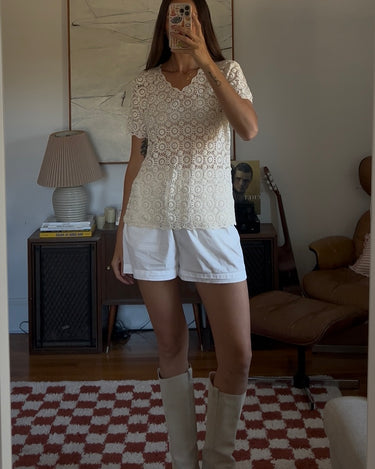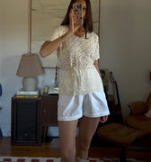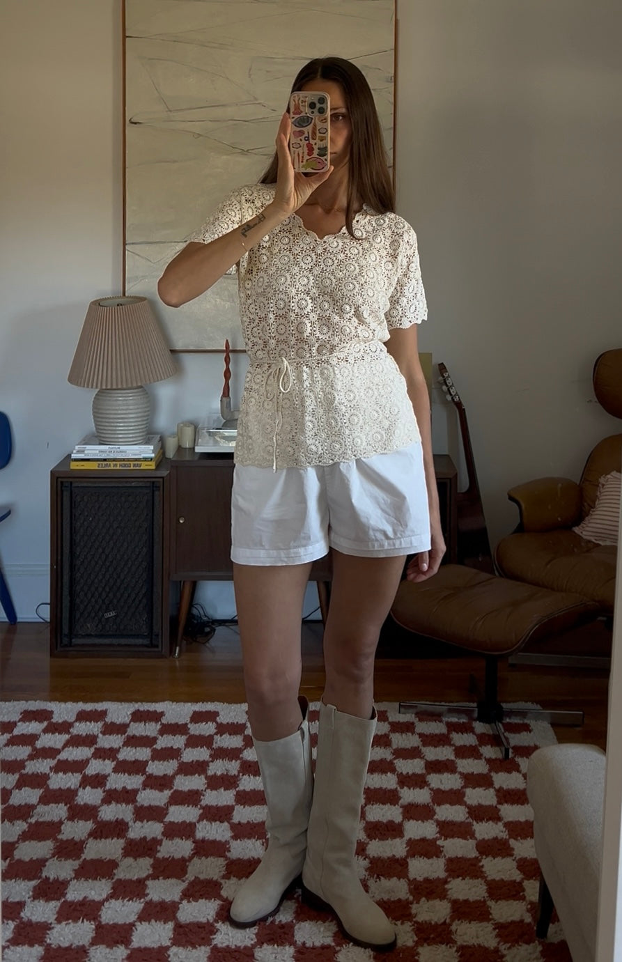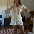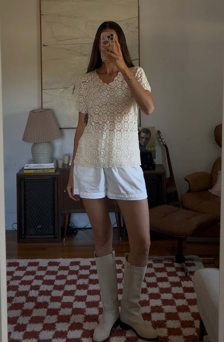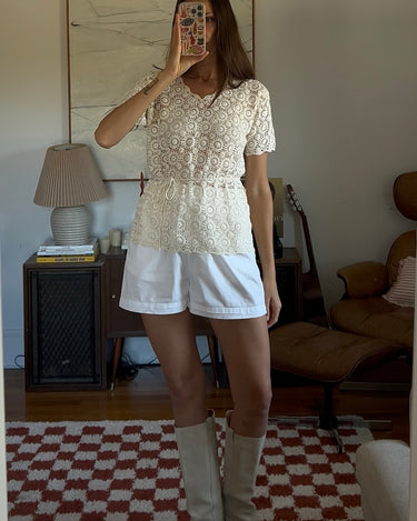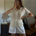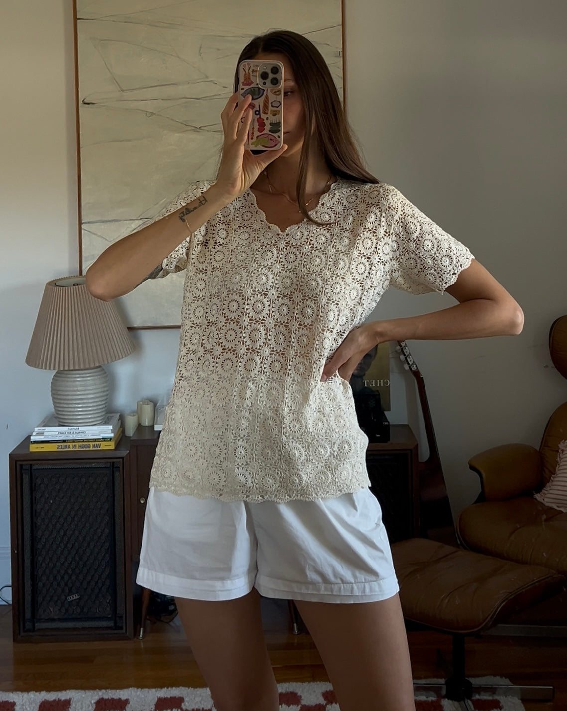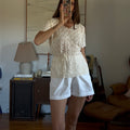 Ornate crochet with hand sewn tag and a tie belt. Unique, stunning and fun to style.